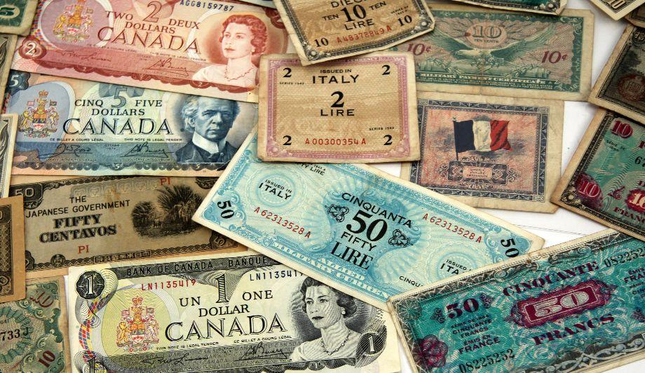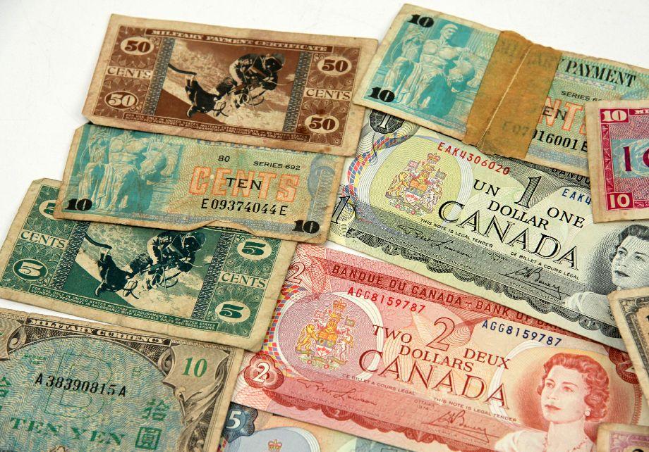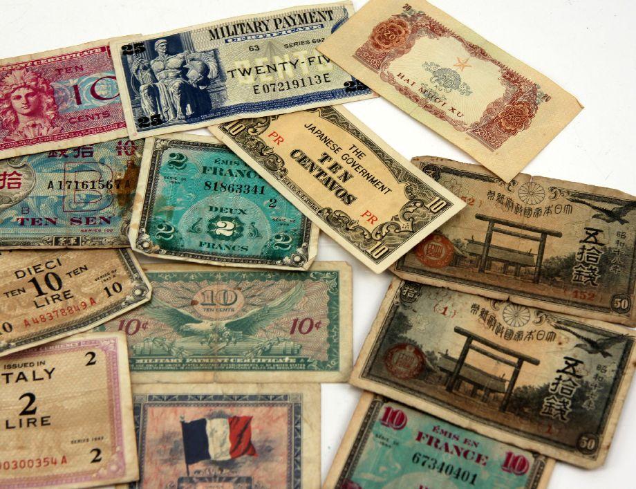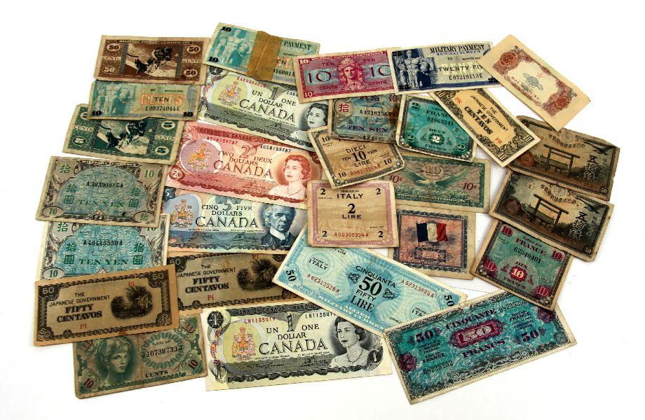 A collection of over 20 WWII to Vietnam military payment and invasion currency notes. Notes are from European and Pacific theatres all from circulation.