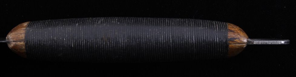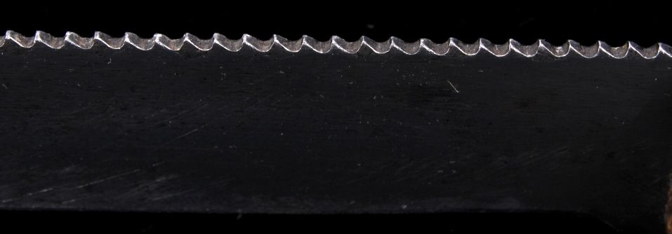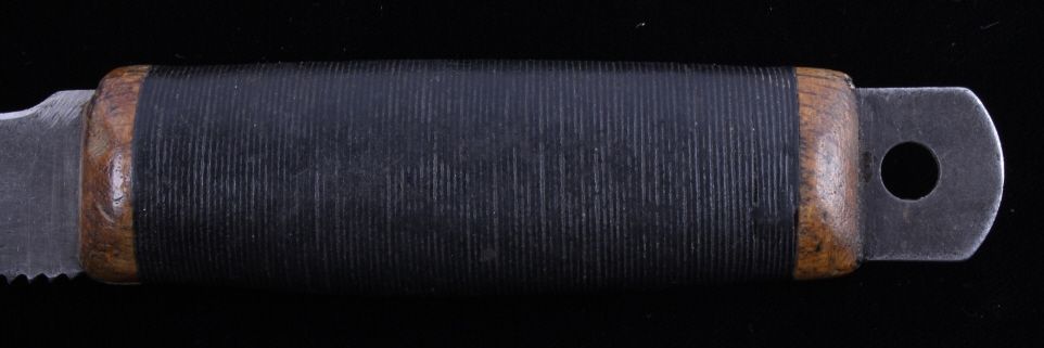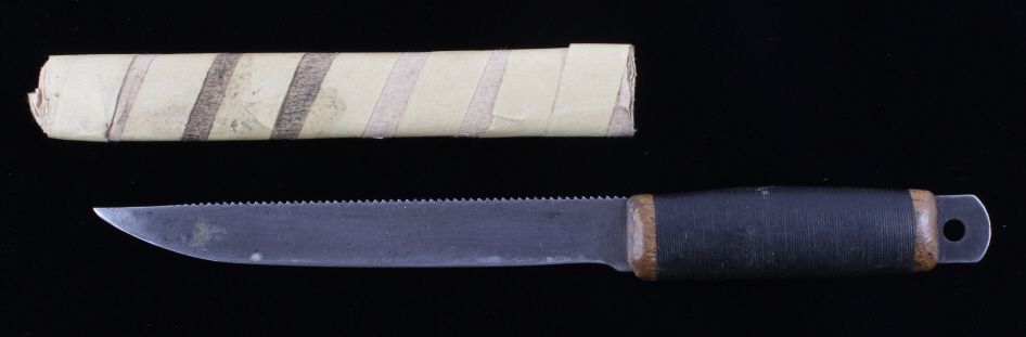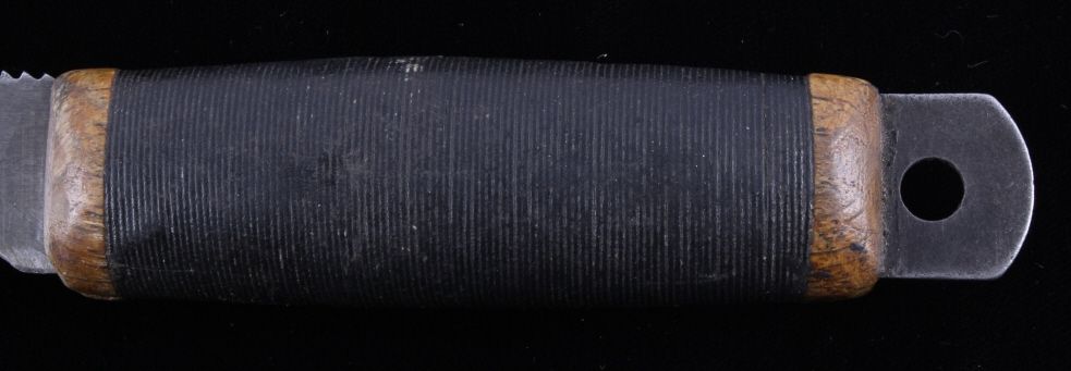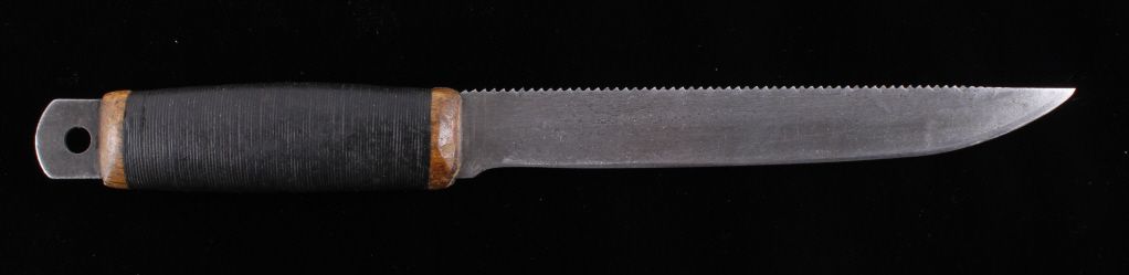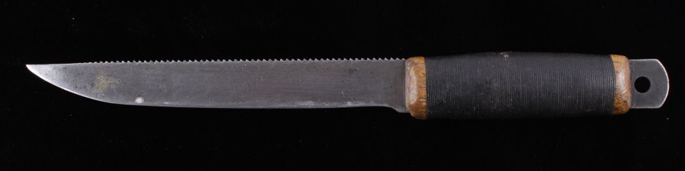 This is an original hand made World War II Theater made knife. The piece was made in the trenches by a soldier occupying his time. This rare piece has a saw back and good condition. Overall measures 11.25" with a 7.75" blade.