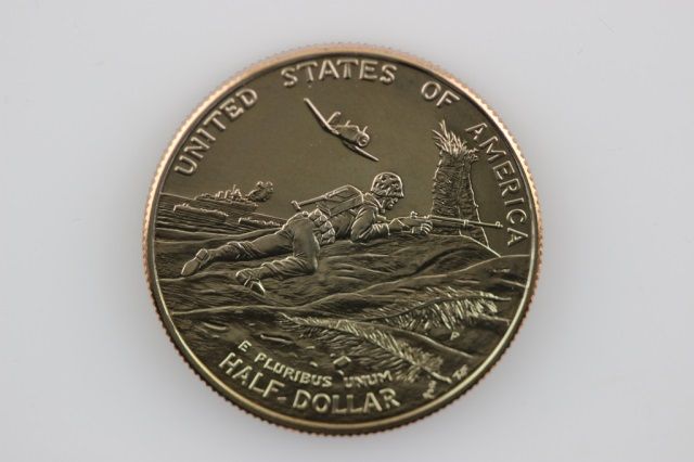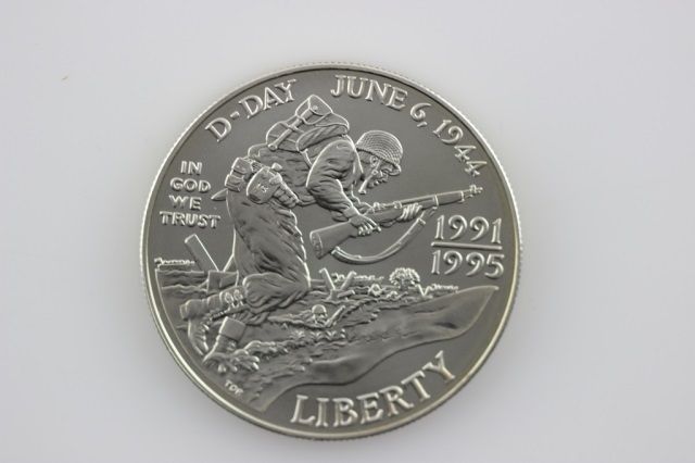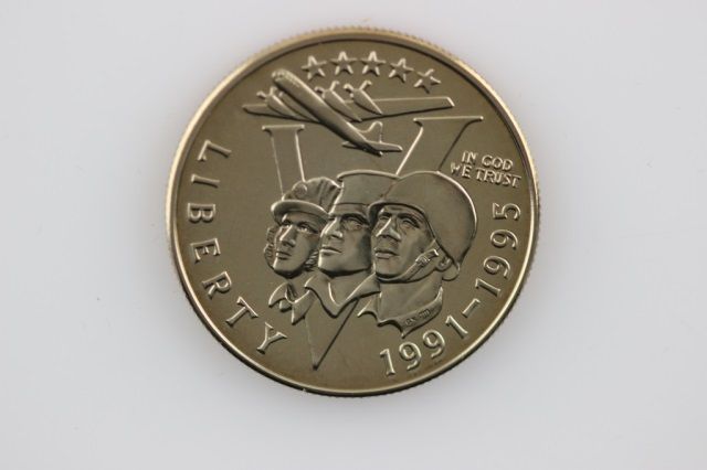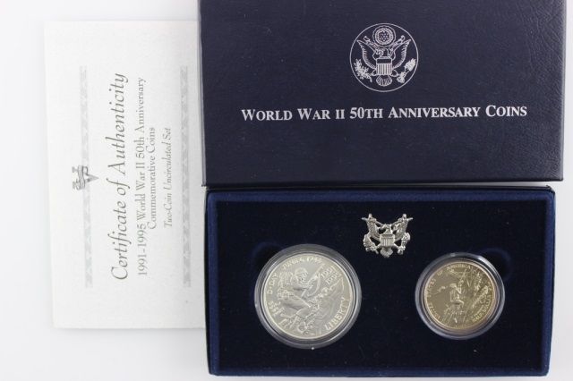 1991-1995 World War II 50th Anniversary Commemorative Coins Two-Coin Uncirculated Set includes: 90% Silver Dollar and a Clad Half Dollar. Comes in original presentation box with COA