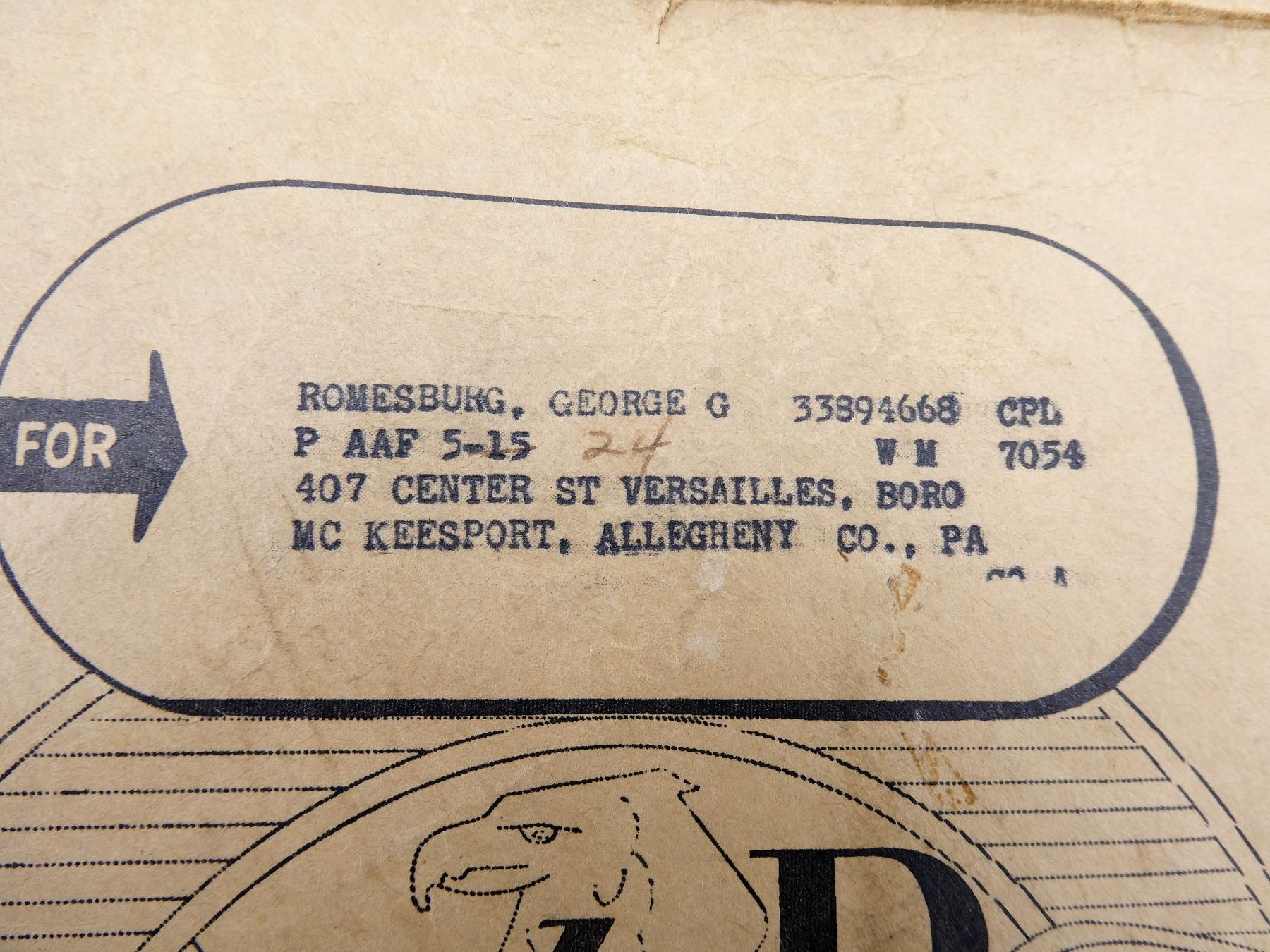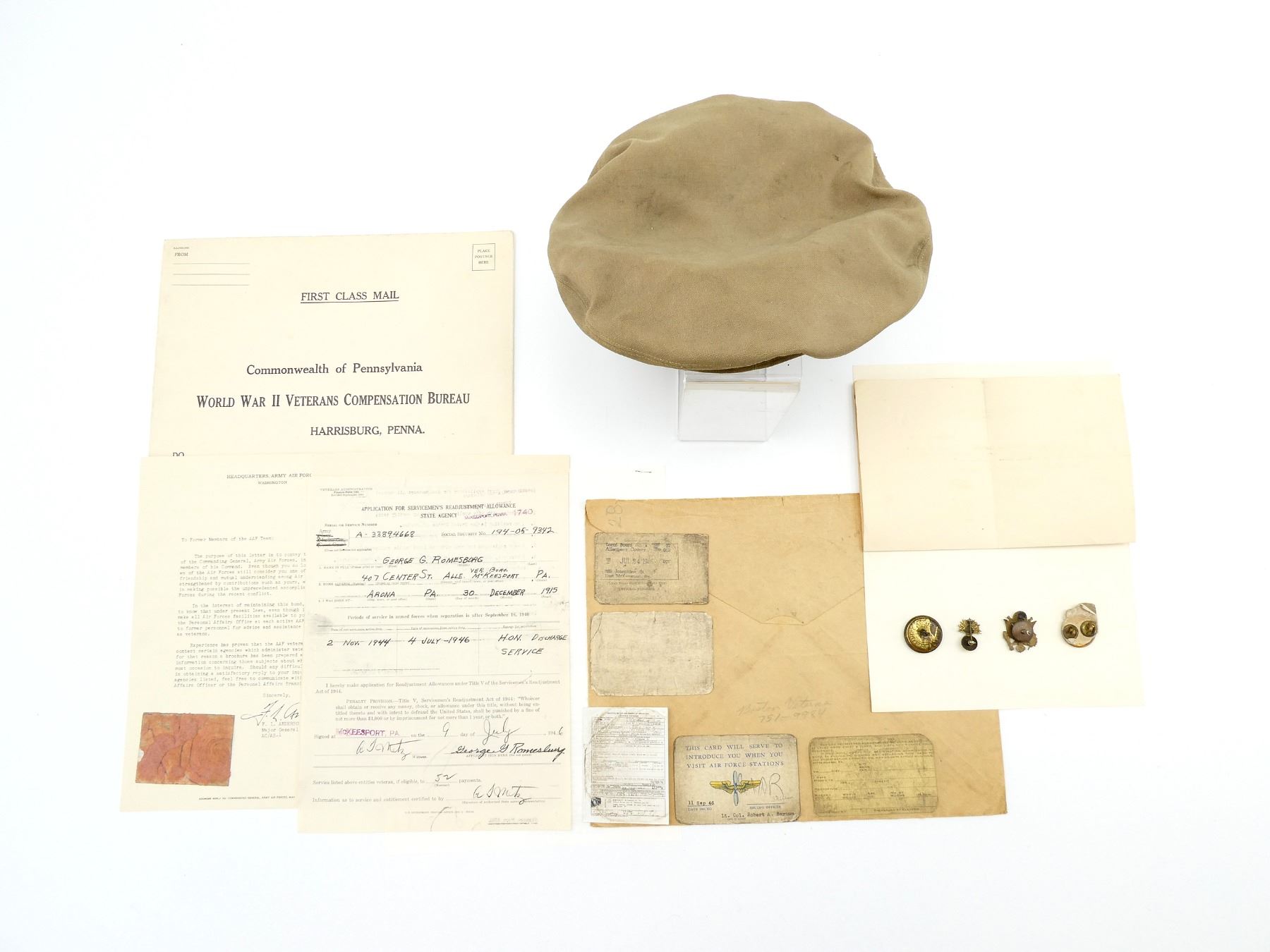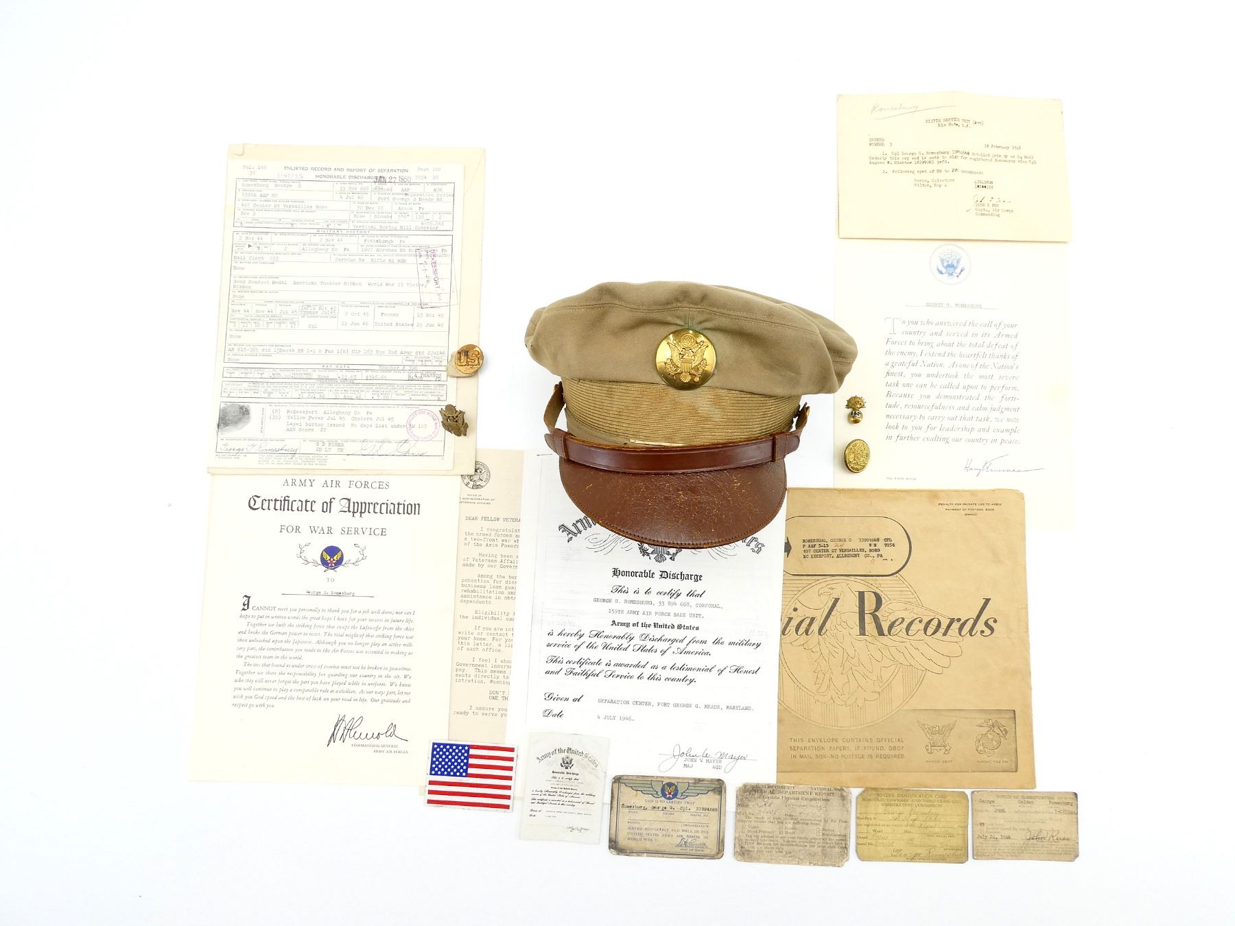 LOT BELONGED TO GEORGE G. ROMESBURG, 33 894 668, CORPORAL, 159TH ARMY AIR FORCE BASE UNIT, LOT INCLUDES; (1) TAN CANVAS PEAKED CAP WITH BRASS EAGLE CAP BADGE, LEATHER CHIN STRAP, BRASS EAGLE BUTTONS, VARIOUS MARKINGS ON INSIDE, CAP DOES NOT HAVE NAME ON IT, SHOWS AGE / WEAR / TEAR, (1) U.S. BRASS BADGE, (1) BRASS FLAMING BOMB MARKED "U.S" BADGE, (1) BRASS EAGLE WITH ARROWS / SHIELD BUTTON, (1) BRASS EAGLE WITH ARROWS / SHIELD CAP BADGE & (1) ENVELOPE WITH VARIOUS OFFICIAL RECORDS OF GEORGE G. ROMESBURG'S SERVICE, HONORABLE DISCHARGE PAPERWORK, VETERANS ADMINISTRATION PAPERWORK, CERTIFICATE OF APPRECIATION FOR WAR SERVICE, LETTER OF THANKS FROM THE WHITE HOUSE, ETC. SEE PHOTOS.