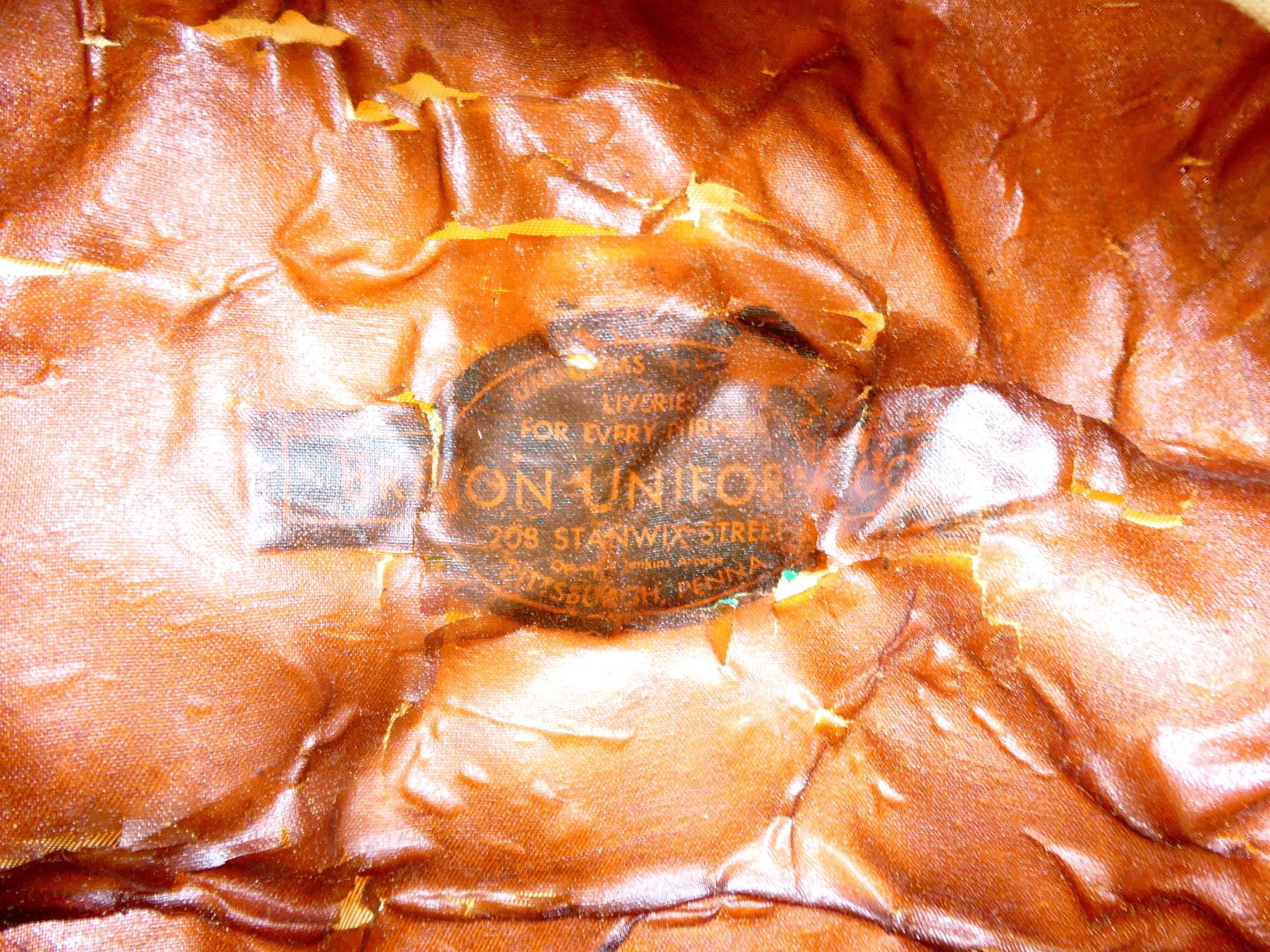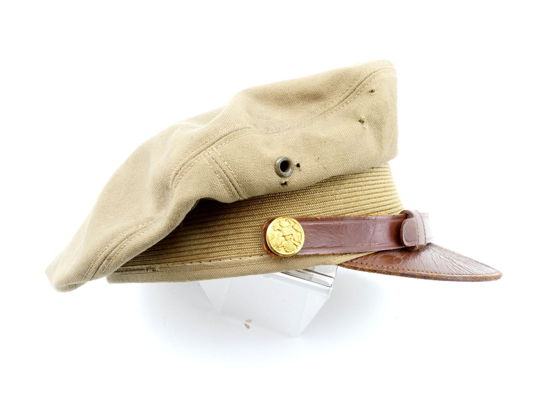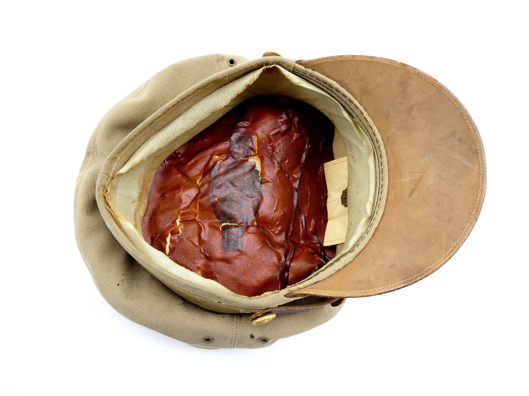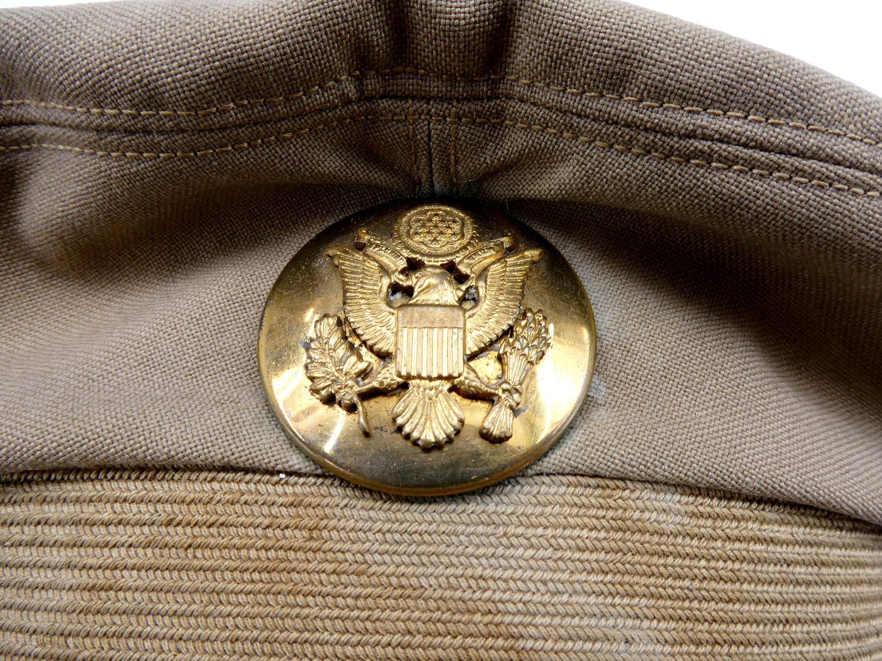 LOT BELONGED TO GEORGE G. ROMESBURG, 33 894 668, CORPORAL, 159TH ARMY AIR FORCE BASE UNIT, LOT INCLUDES; (1) TAN CANVAS PEAKED CAP WITH BRASS EAGLE CAP BADGE, LEATHER CHIN STRAP, BRASS EAGLE BUTTONS, VARIOUS MARKINGS ON INSIDE, CAP DOES NOT HAVE NAME ON IT, SHOWS AGE / WEAR / TEAR, (1) U.S. BRASS BADGE, (1) BRASS FLAMING BOMB MARKED "U.S" BADGE, (1) BRASS EAGLE WITH ARROWS / SHIELD BUTTON, (1) BRASS EAGLE WITH ARROWS / SHIELD CAP BADGE & (1) ENVELOPE WITH VARIOUS OFFICIAL RECORDS OF GEORGE G. ROMESBURG'S SERVICE, HONORABLE DISCHARGE PAPERWORK, VETERANS ADMINISTRATION PAPERWORK, CERTIFICATE OF APPRECIATION FOR WAR SERVICE, LETTER OF THANKS FROM THE WHITE HOUSE, ETC. SEE PHOTOS.