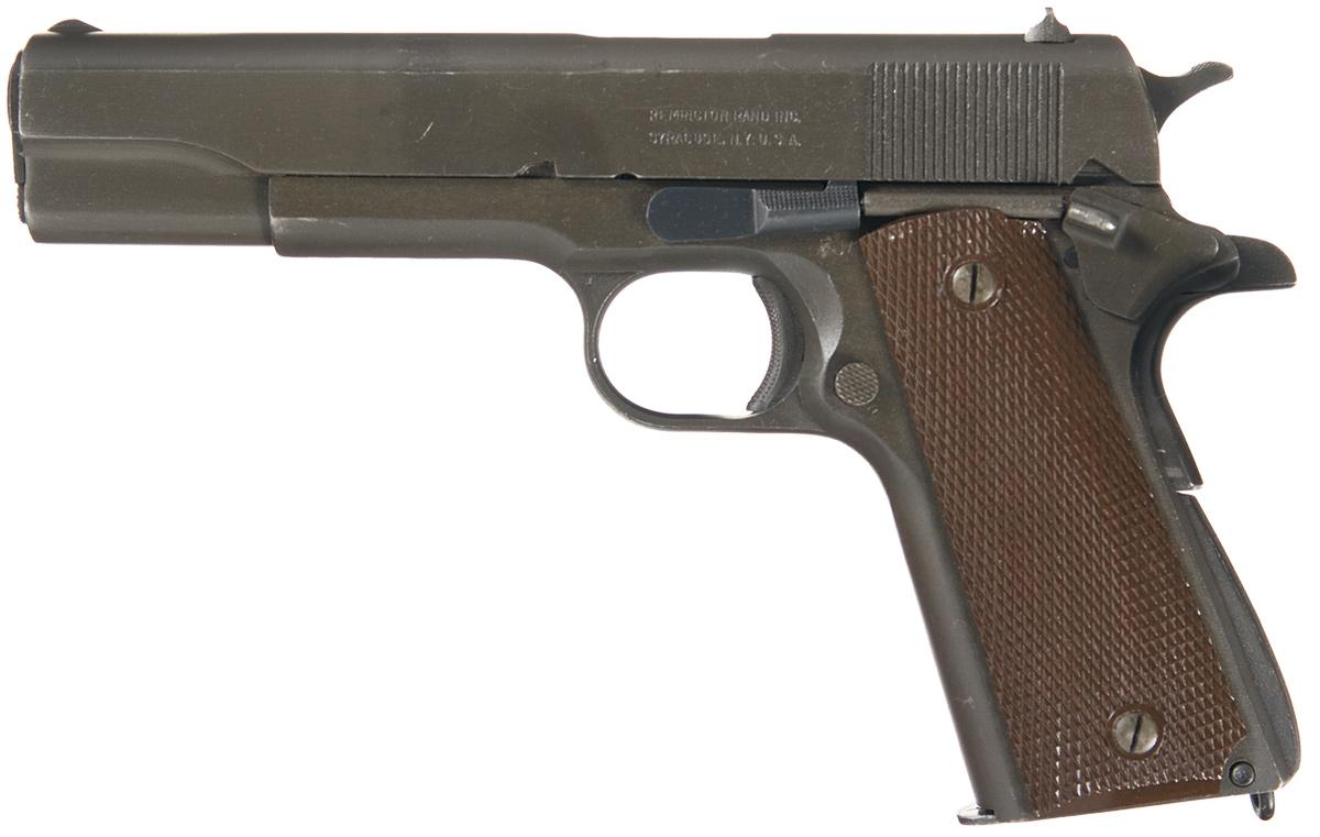 This an excellent example of a late 1944 production Remington-Rand production M1911A1 pistol. These pistols were the standard service pistol throughout WWII, Korea and Vietnam. The left side of the slide marked "REMINGTON RAND INC. / SYRACUSE, N.Y. U.S.A." and "P" on top ahead of the rear sight. The right side of the frame is stamped with a faint Ordnance Corps cartouche behind the grips, "UNITED STATES PROPERTY" over the serial number and "M 1911 A1 U.S. ARMY" in front of the slide stop pin hole. The left side of the frame is stamped with Frank J. Atwood's inspector mark "FJA" (A faint) and "P" below the magazine release. It has the late WWII parts such as the checkered stamped trigger, thin hammer spur, checkered thumb safety, and slide catch, serrated mainspring housing and Keyes Fibre grips with reinforcement ring around the screw holes. It is fitted with a blue barrel and a blue magazine marked "L" on the lip.