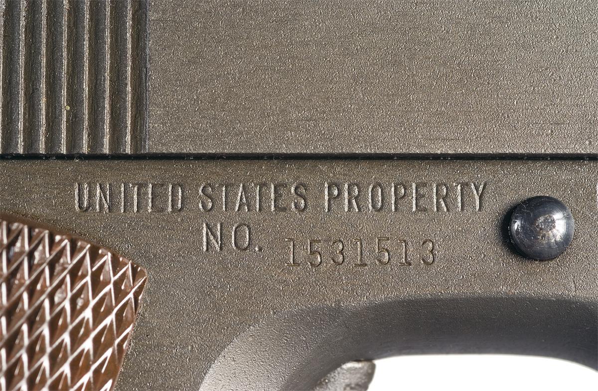 Condition: Excellent. The pistol retains 98% plus original parkerized finish with high edge wear on the slide and front of the frame, some mild thinning on the grip safety and a few minor handling marks. With the exception of a few minor chips on the right panel, the grips are excellent with sharp checkering. Mechanically excellent.