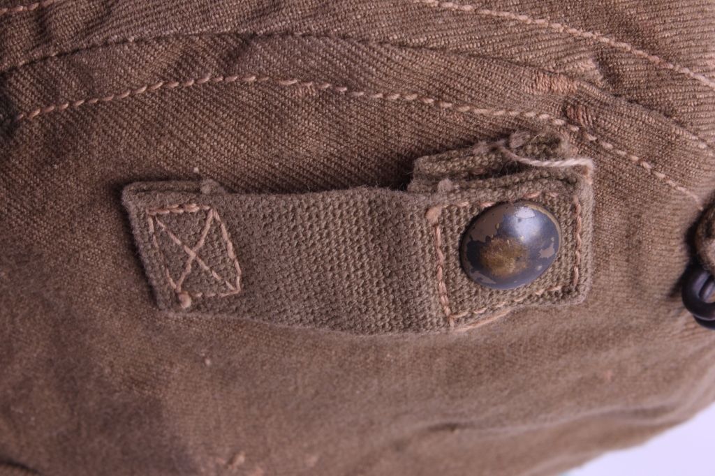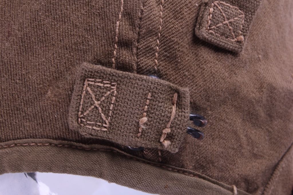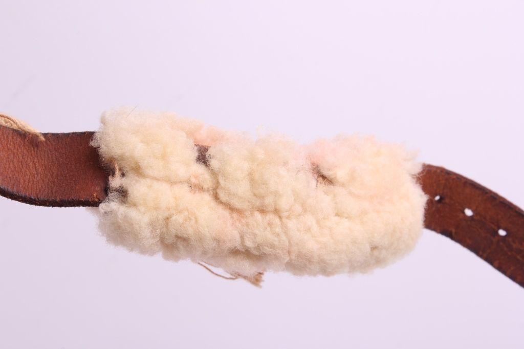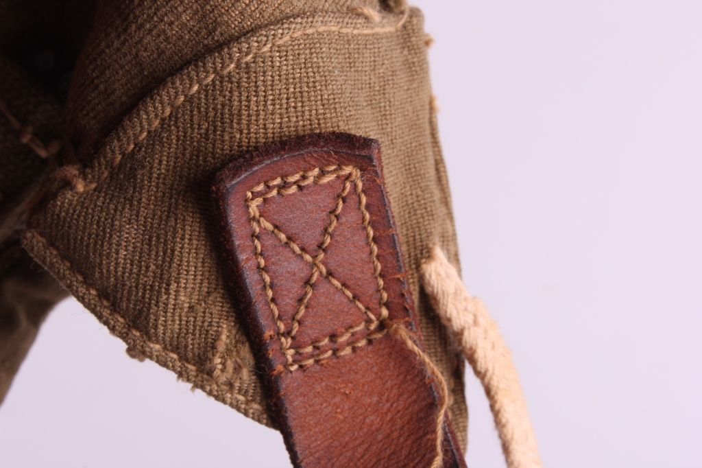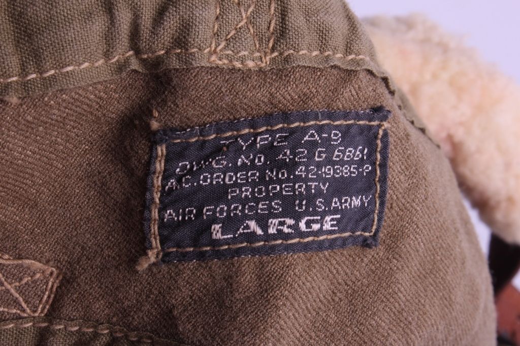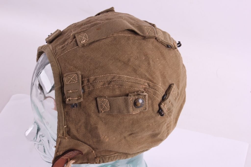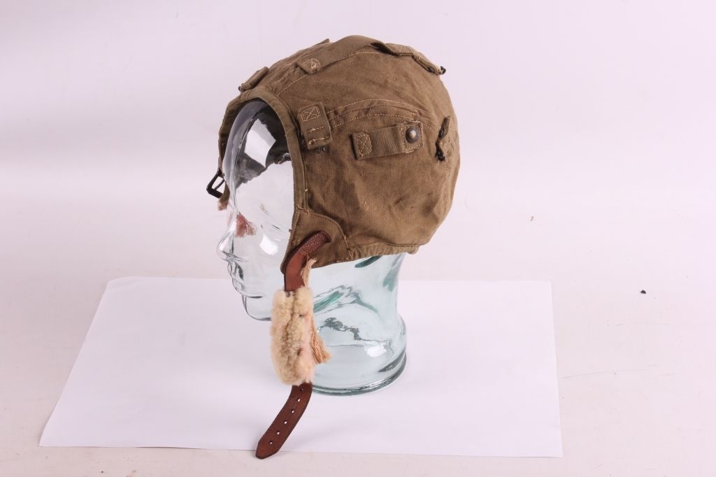This is a U.S. Army and Air Force type A-9 flight helmet. This helmet is made from canvas and has the original chin strap. The helmet is in good condition. It is size large.