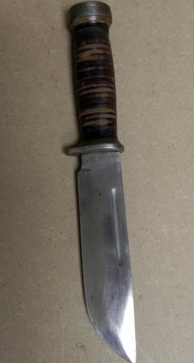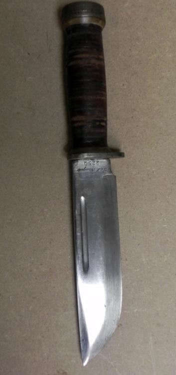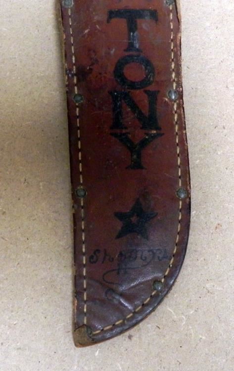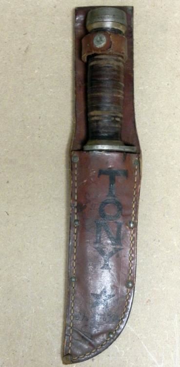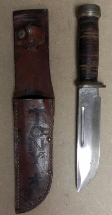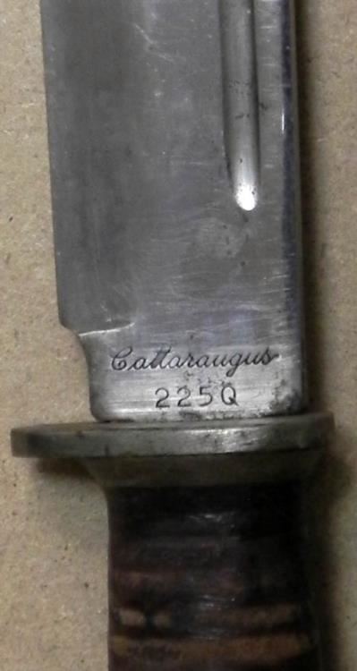 THIS IS A WWII U.S. CATTARAUGUS 225Q FIGHTING/SURVIVAL KNIFE-NAMED. THIS IS AN OUTSTANDING WWII ORIGINAL U.S. CATTARAUGUS 225Q FIGHTING/SURVIVAL KNIFE AND NAMED SHEATH-GREAT LOOKING BLADE, UN-SHARPENED. RICASSO MARKED "CATTARAUGUS 225Q"-LEATHER WASHER GRIP-BLADE IS 6"-TOP TO BOTTOM 10 5/8"--ORIGINAL TO KNIFE LEATHER SHEATH WITH TOP RETAINER STRAP--STITCHING SOUND-G.I. NAME ON SCABBARD "TONY--w/ARMY STAR"-TOP OD SHEATH HAS NAIL HOLE WHERE PROUD GI HUNGHIS FIGHTING KNIFE WITH PRIDE.