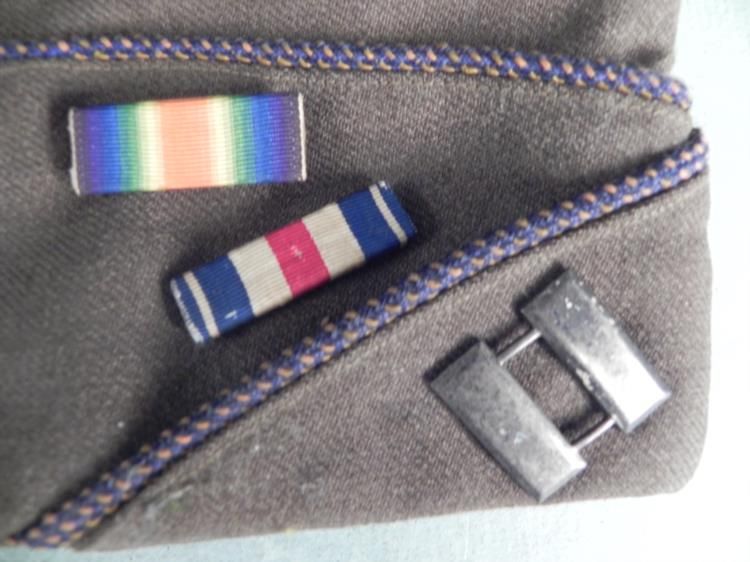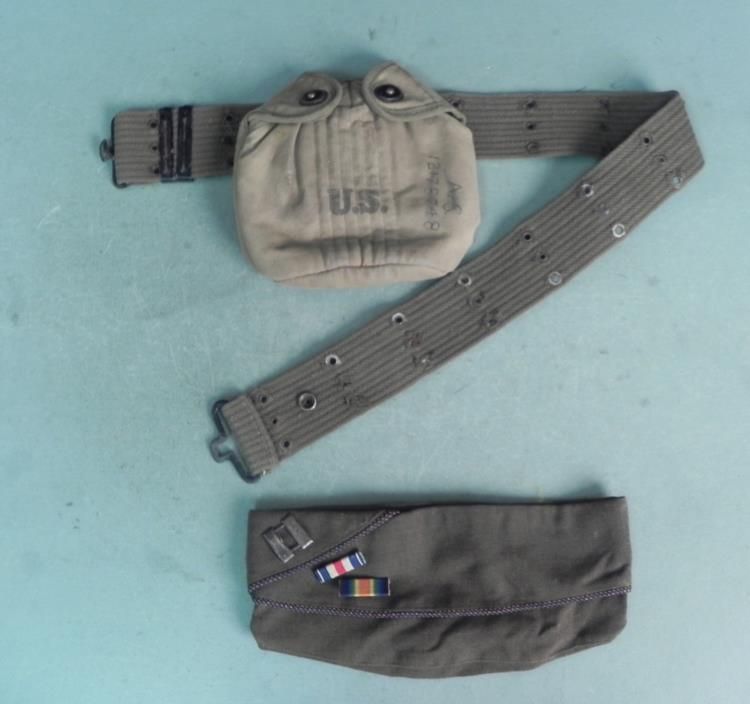 WWII U.S. ETO OVERSEAS CAP W/ RIBBON BARS-CANTEEN COVER & WEB BELT OVERSEAR OFFICER'S CAP WITH LARGE NAZI METAL INSIGNIA-2 RIBBON BARS (US) & CPL INSIGNIA--ALSO, WEB BELT (SLIGHT DAMAGE) WITH CANTEEN COVER (NAMED)-NICE GROUPING