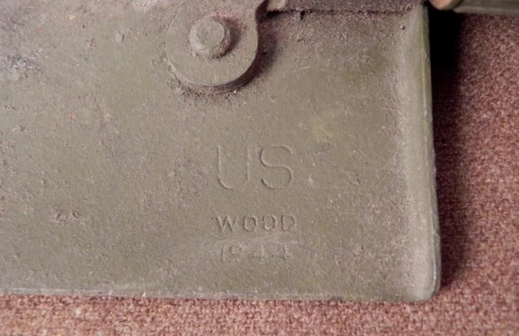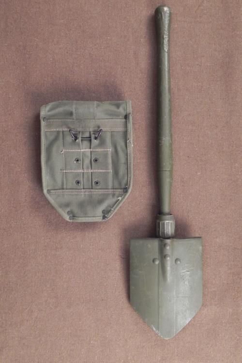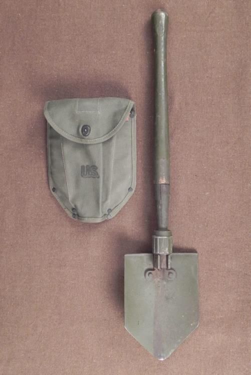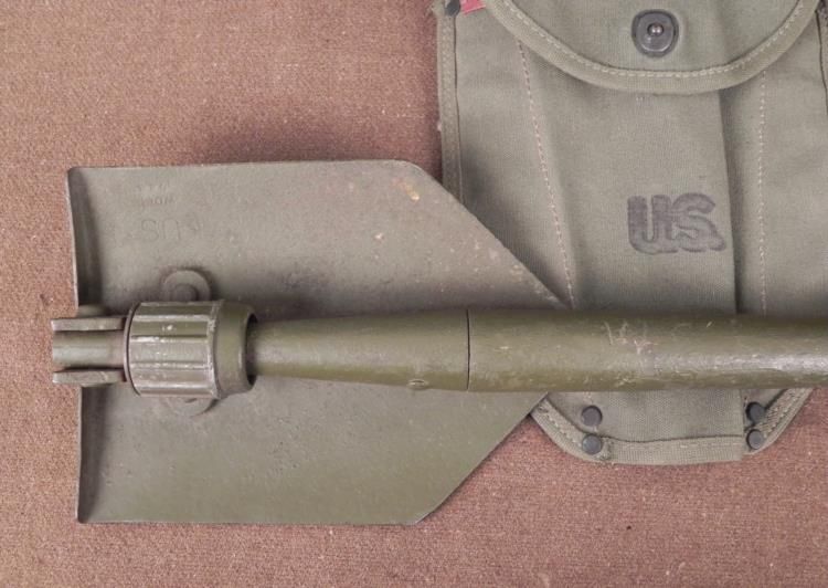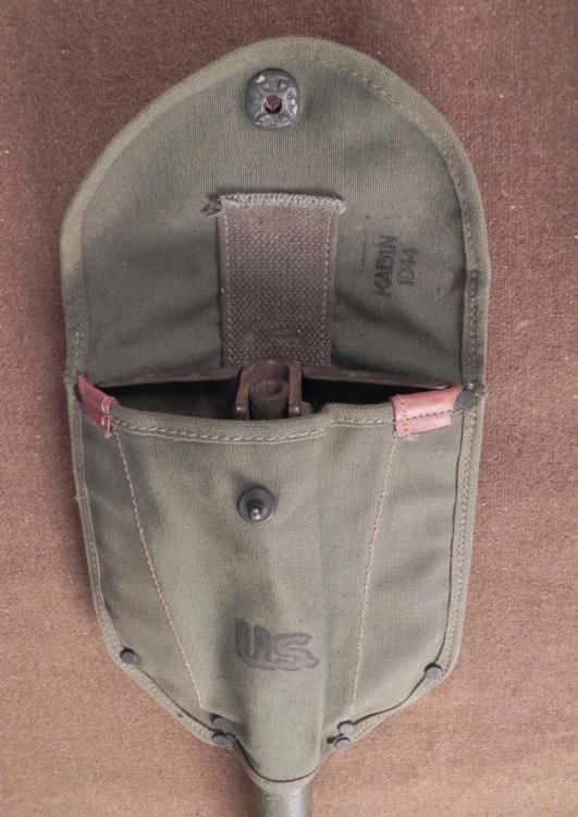 WWII U.S. FOLDING TRENCH SHOVEL W/CANVAS COVER-1944-WELL MARKED * * MARKED U.S. WOOD (MAKER)-1944--OD CANVAS SNAP-CLOSED COVER MARKED "US"--INSIDE MAKER "KADIN-1944"--REVERSE HAS WEB BELT HOOKS-GREAT CONDITION *