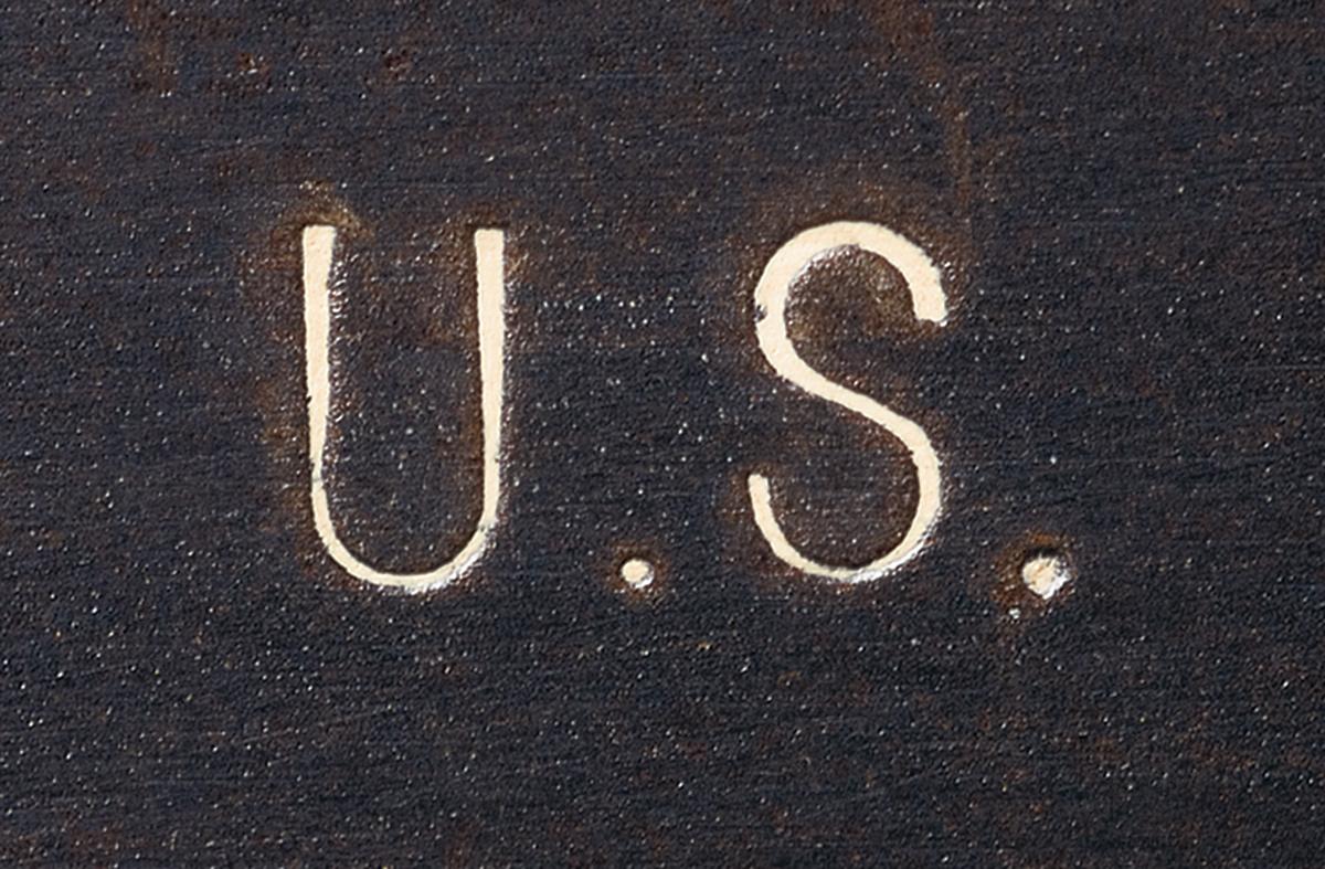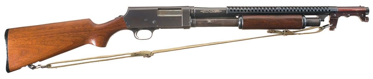 This is an example of a correct "as issure" WWII U.S. Army Stevens contract 520-30 trench shotgun, with correct bayonet lug adapter, 6-hole ventilated handguard, two line gauge marking on the left side of the barrel (cylinder choke, 2 3/4 inch chamber) and the three line address on the right side of the barrel. The left side of the receiver is marked "U.S", along with the model marking and "P / ordnance bomb". All blue finish. Smooth forearm and pistol grip stock, canvas sling and serrated plastic buttplate.