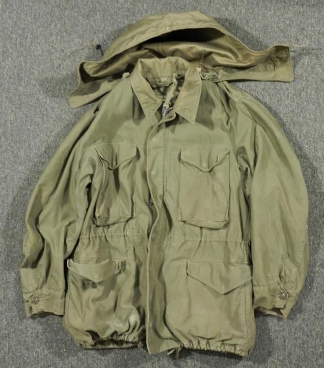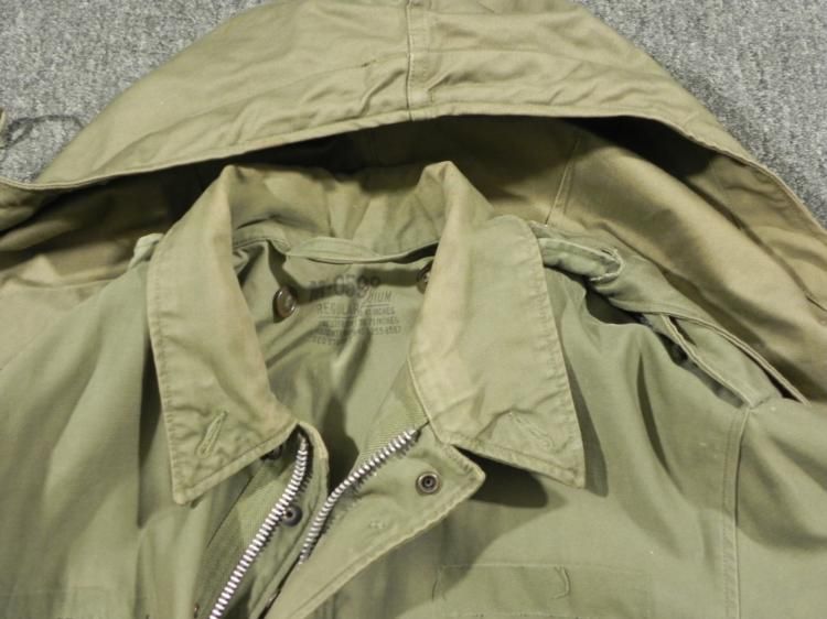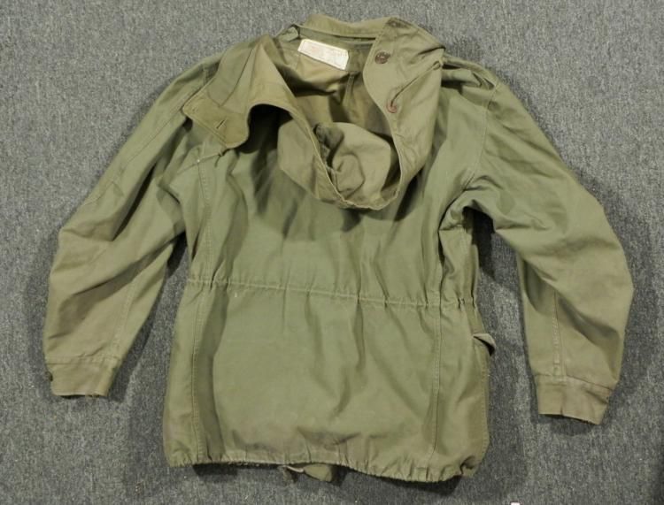 WWII U.S.M-1943 FIELD JACKET & HOOD-OD-WINTER WEIGHT-GREAT CONDITION * STAMPED INSIDE "M-0598-REGULAR-MEDIUM SIZE-ZIPPER WORKS FINE-HEAVY WINTER WEIGHT JACKET & HOOD TO BE WORN OVER HELMET-HOOD DETACHES *