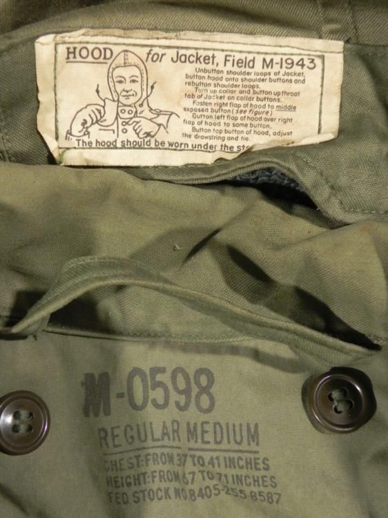 WWII U.S.M-1943 FIELD JACKET & HOOD-OD-WINTER WEIGHT-GREAT CONDITION * STAMPED INSIDE "M-0598-REGULAR-MEDIUM SIZE-ZIPPER WORKS FINE-HEAVY WINTER WEIGHT JACKET & HOOD TO BE WORN OVER HELMET-HOOD DETACHES *