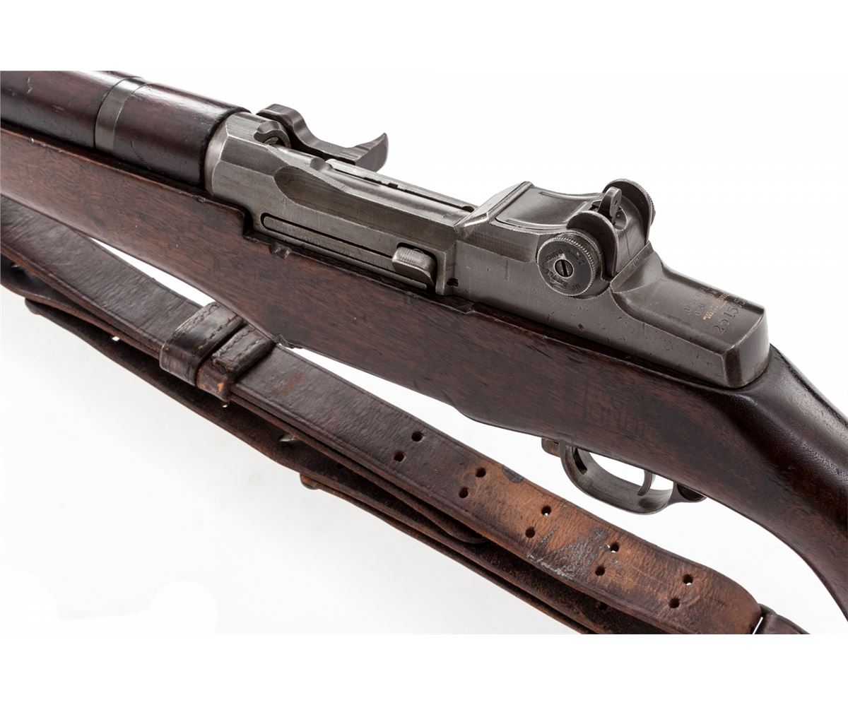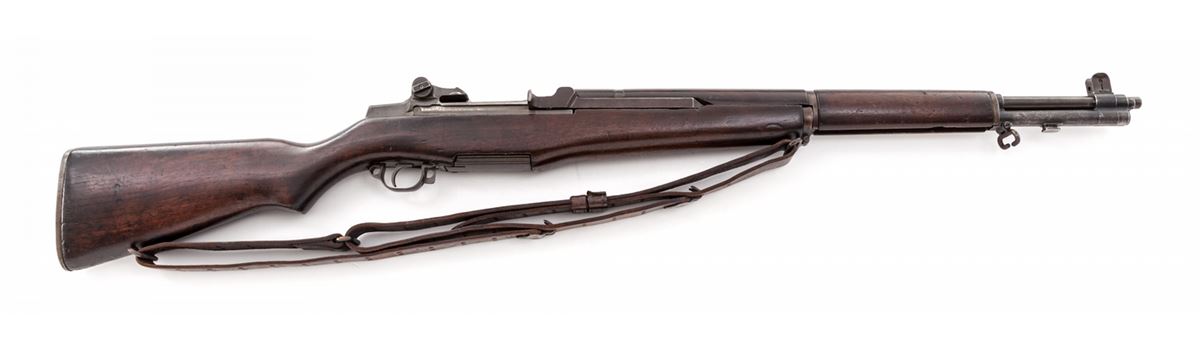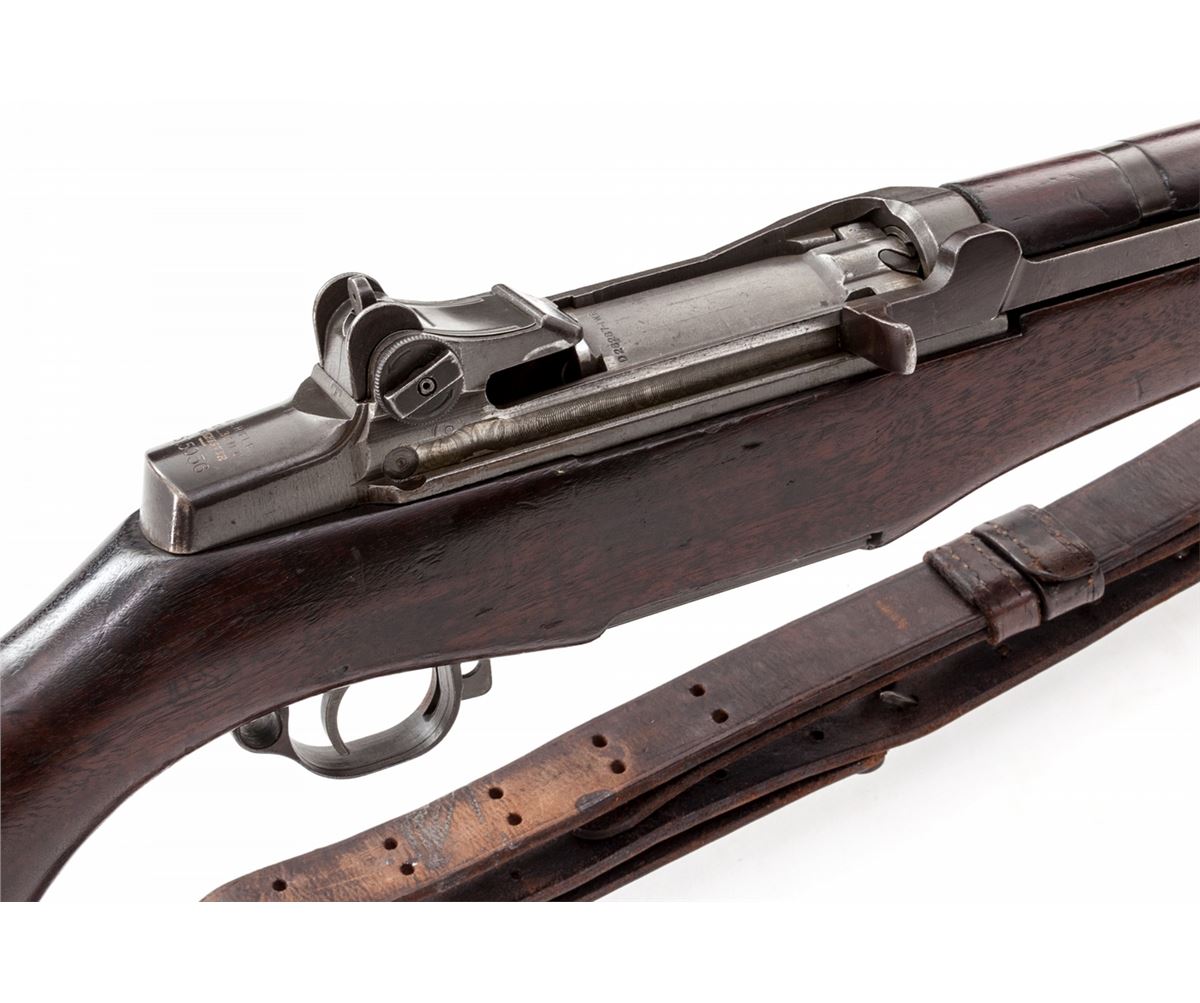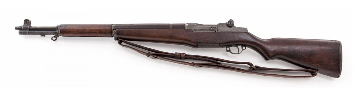 WWII U.S. M1 Garand, by Winchester, #2515056, .30-06 cal., 24'' barrel, parkerized finish, Winchester cartouched walnut stock, and 1942 dated leather sling. Original lock bar sights are retained. Internal parts all appear to be of Winchester mfg. as does buttplate, wide-earred front sight, op rod, barrel, triggerguard, safety etc. Rifle shows every indication of being a WWII bring-back being originally mfg'd in Fall 1944. Condition is very good retaining approx. 90% thinning original finish. Faint ''WRA/GHD'' cartouche to left side, with light ''FA'' cartouche to right side. Stock with scuffs, light dings, and oil darkening. Good action, fine bore. Est.: $3,000-$5,000. (C&R)