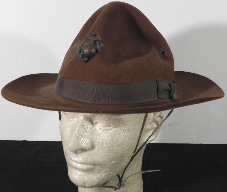 WWII U.S MARINES DRILL SGT CAMPAIGN HAT-QUALITY ORIGINAL-WITH BRASS EMBLEM * COMPLETE WITH MARINE EMBLEM, CHINSTRAP, BAND AND SWEATBANT *