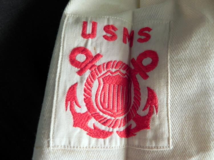WWII U.S. MERCHANT SEAMAN GROUPING-UNIFORM -MANUAL HATS+---WWII U.S. MERCHANT SEAMAN WHITE SUMMER UNIFORM WITH INSIGNIA--(BOTH JUMPER & PANTS--BLUE WINTER SAILOR'S HAT WITH usms TALLY---BLUE & WHITE HAT TOPS--BLUE WORK SHIRT & "AMERICAN MERCHANT SEAMAN'S MANUAL" HAND BOUND-MARCH 1942 EDITION-670 PAGES