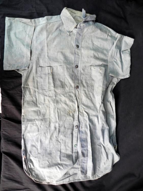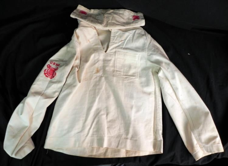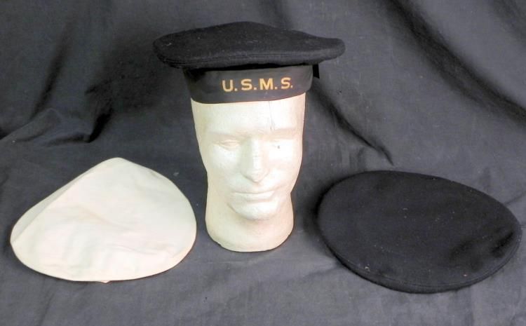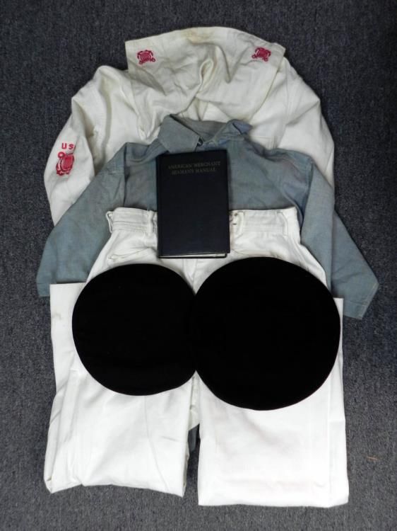 WWII U.S. MERCHANT SEAMAN GROUPING-UNIFORM -MANUAL HATS+---WWII U.S. MERCHANT SEAMAN WHITE SUMMER UNIFORM WITH INSIGNIA--(BOTH JUMPER & PANTS--BLUE WINTER SAILOR'S HAT WITH usms TALLY---BLUE & WHITE HAT TOPS--BLUE WORK SHIRT & "AMERICAN MERCHANT SEAMAN'S MANUAL" HAND BOUND-MARCH 1942 EDITION-670 PAGES