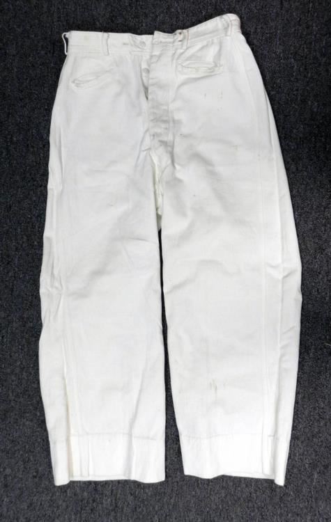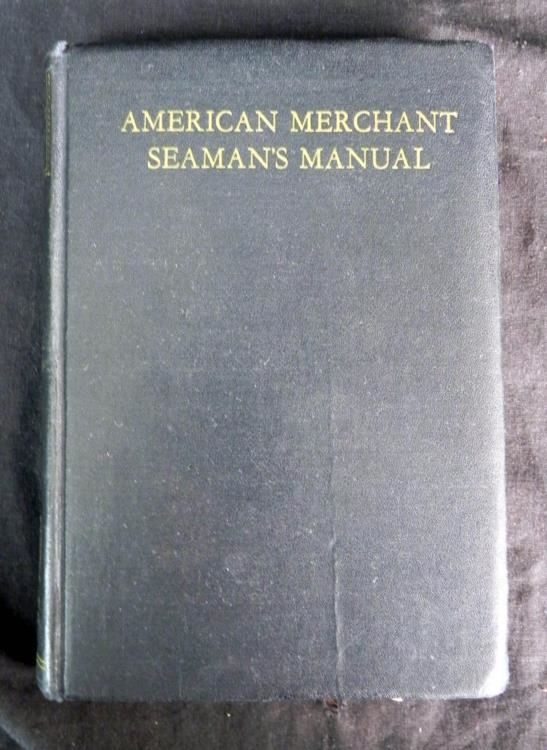 WWII U.S. MERCHANT SEAMAN GROUPING-UNIFORM -MANUAL HATS+---WWII U.S. MERCHANT SEAMAN WHITE SUMMER UNIFORM WITH INSIGNIA--(BOTH JUMPER & PANTS--BLUE WINTER SAILOR'S HAT WITH usms TALLY---BLUE & WHITE HAT TOPS--BLUE WORK SHIRT & "AMERICAN MERCHANT SEAMAN'S MANUAL" HAND BOUND-MARCH 1942 EDITION-670 PAGES