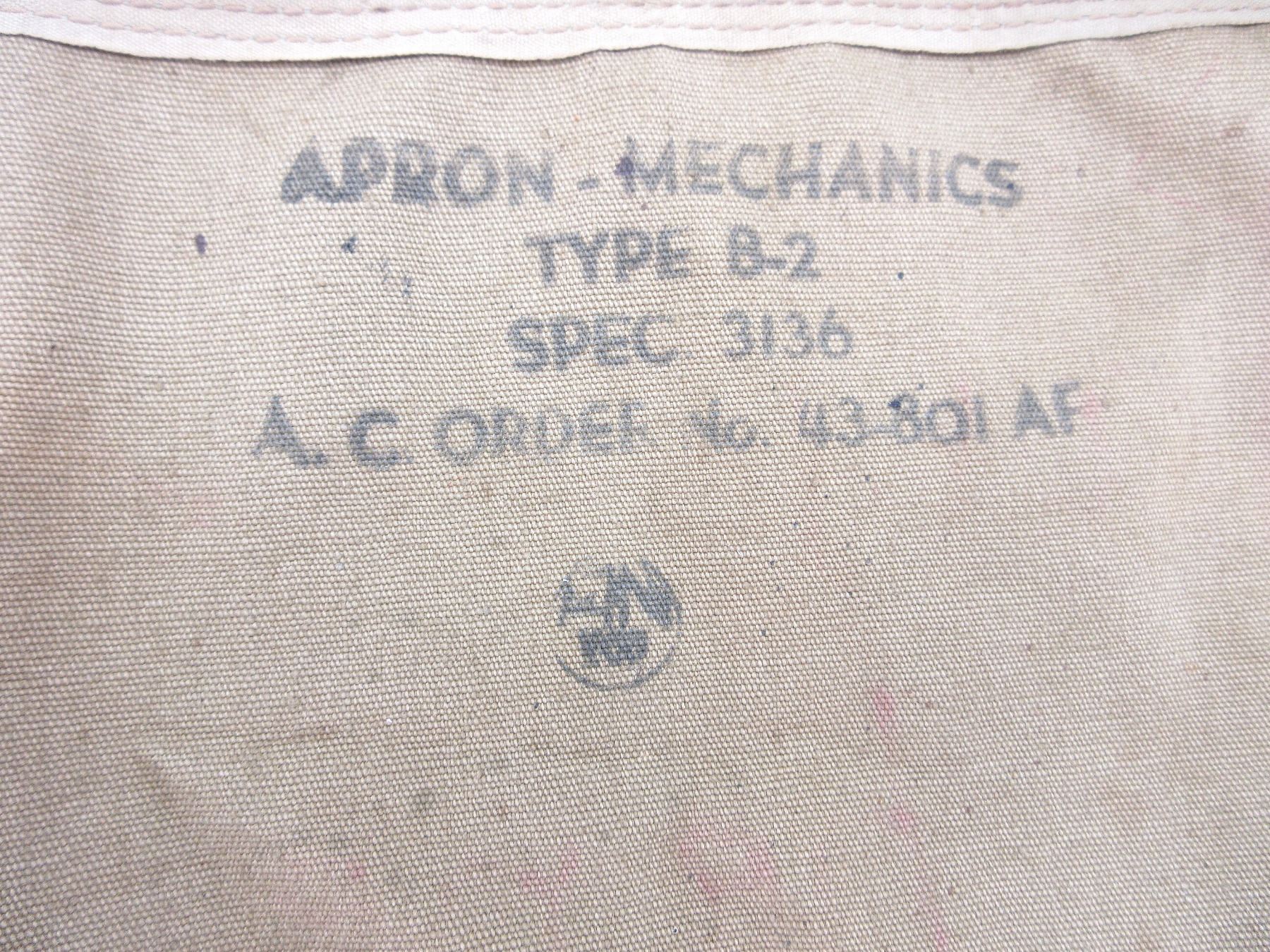 (1) TAN CANVAS MECHANICS APRON USED BY AIRCRAFT MECHANICS IN THE U.C ARMY AIR FORCE, NECK STRAP & TIE-UP, MARKED: "APRON - MECHANICS, TYPE B-2, SPEC.3136, A.C. ORDER NO. 43-801 AF"& MAKERS MARK. VARIOUS OTHER FAINT / UN-CLEAR MARKINGS. SEE PHOTOS.