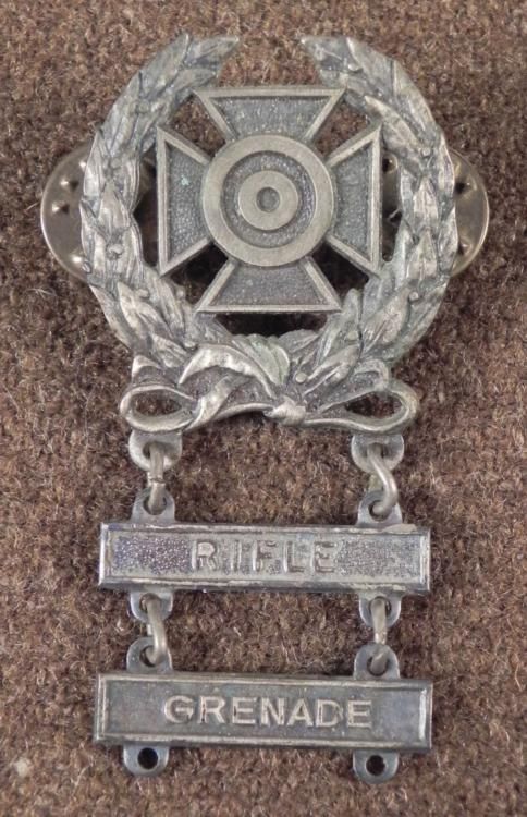 WWII U.S. MILITARY EXPERT QUALIFICATION BADGE W/RIFLE & GRENADE BARS-NICE ORIG * CRIMP BACK AND MARKED *