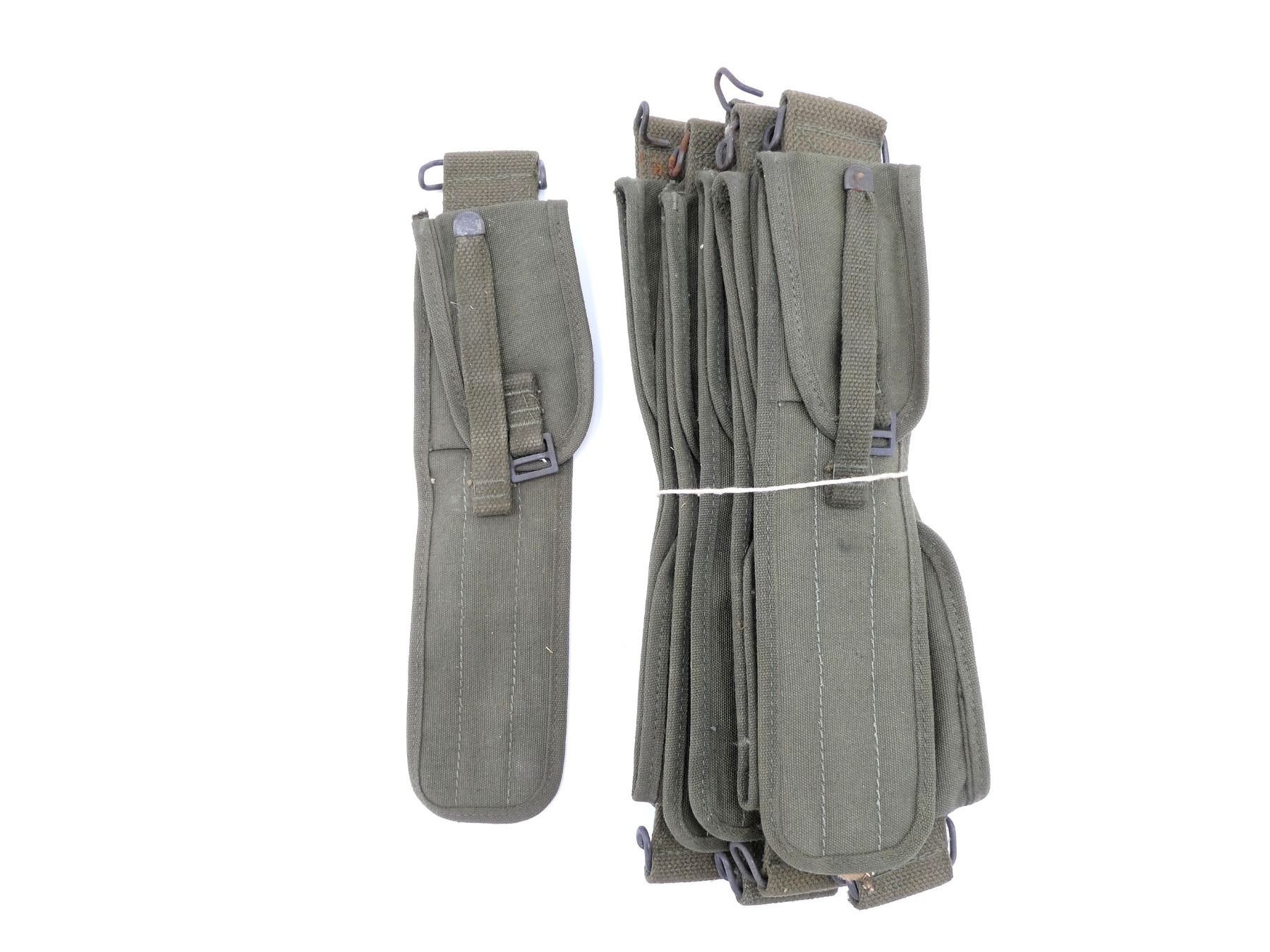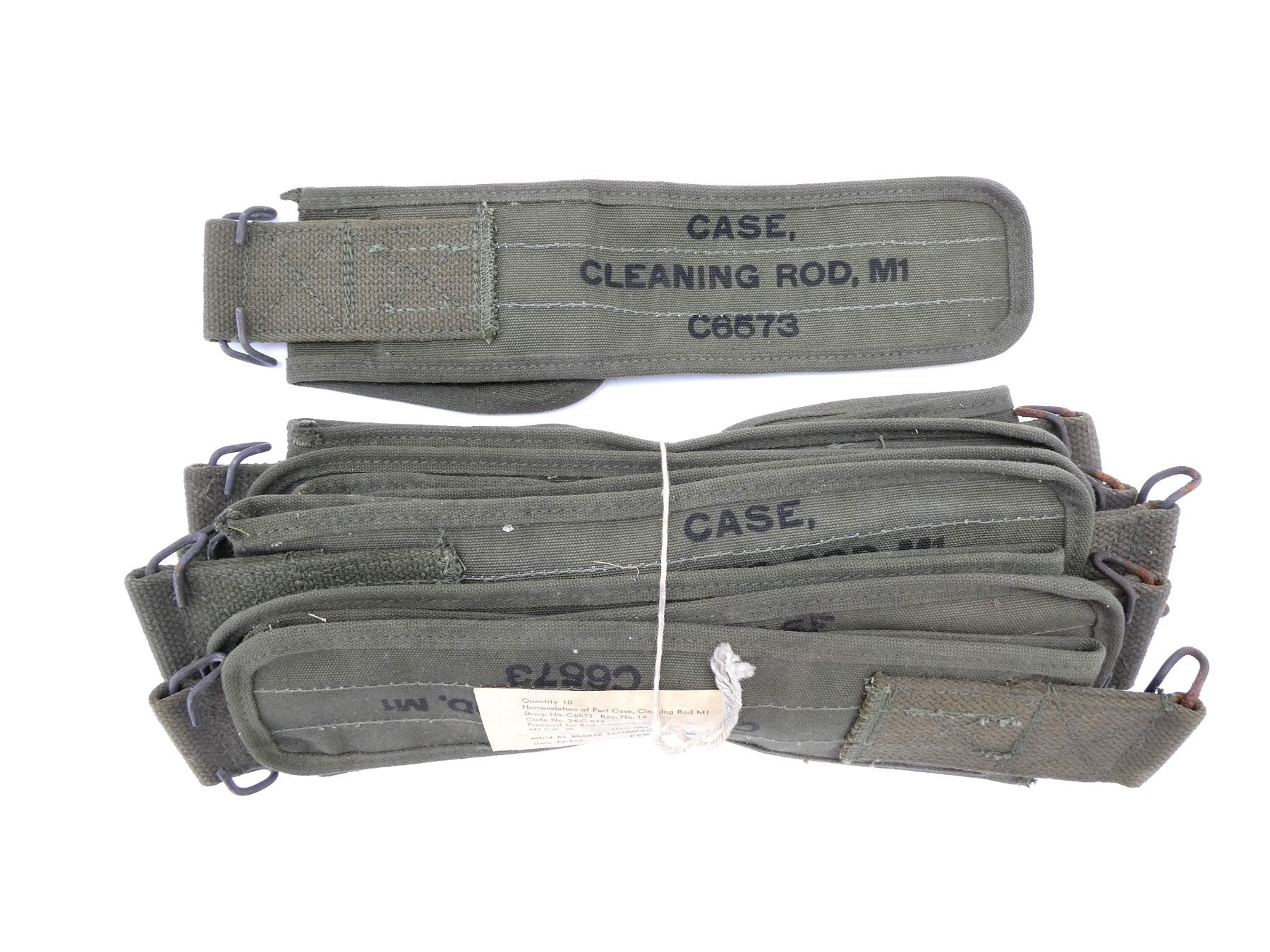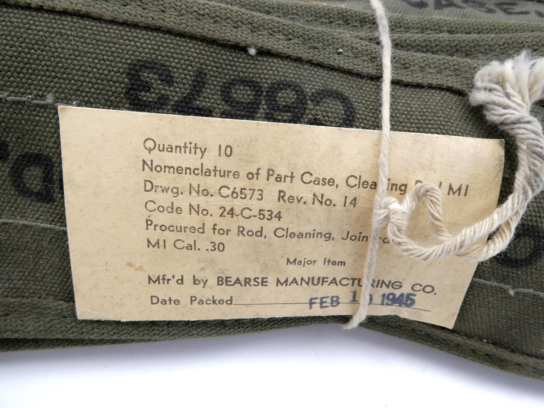 LOT INCLUDES; (10) GREEN CANVAS M1 CLEANING ROD CASES, TIED IN BUNDLE OF 10, CARD MARKED: "QUANTITY 10, NOMENCLATURE OF PART CASE, CLEANING ROD M1, DRWG. NO. C6573 REV. NO. 14, CODE NO. 24-C-534, PROCURED FOR ROD, CLEANING, JOINTED, MI CAL. .30, MAJOR ITEM, MFR'D BY BEARSE MANUFACTURING CO., DATE PACKED FEB 15 1945", CANVAS CASES MARKED: "CASE, CLEANING ROD, M1, C6573", NOS. SEE PHOTOS.