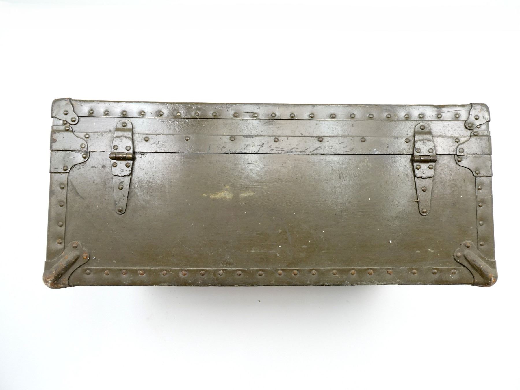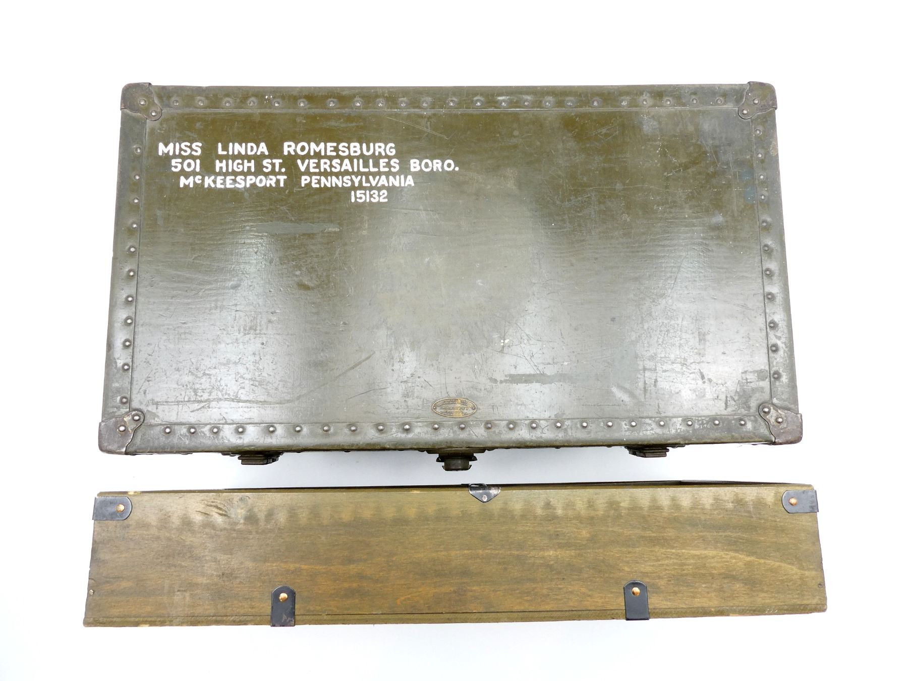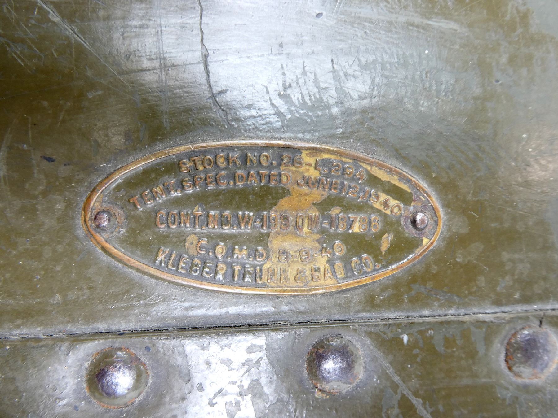 (1) GREEN PAINTED WOOD & METAL CONSTRUCTED TRUNK, DATA PLATE ON LID MARKED: "STOCK NO. 26-L 294, TENT. SPEC. DATED JUNE 12 1940, CONT. NO. W-199 QM-18786, C.Q.M.D. 8-9-40, KLEBER TRUNK & BAG CO." & VARIOUS OTHER MARKINGS ON TRUNK, MISSING / BROKEN LEATHER CARRY HANDLES ON EITHER SIDE, METAL HINGES / LATCHES, LOCKABLE, WITH KEY, WOODEN BOX INSERT INSIDE, LIFTS OUT, TRUNK SHOWS WEAR / TEAR, APPROX. 31" X 17.25" X 13". SEE PHOTOS.