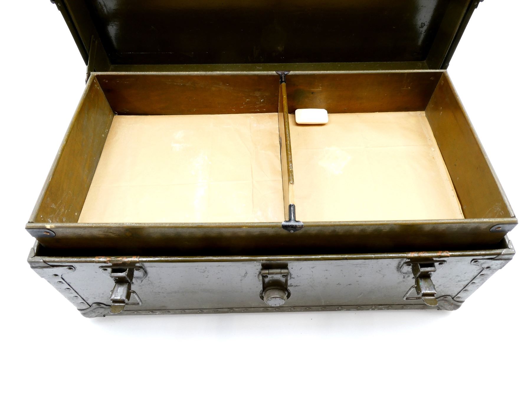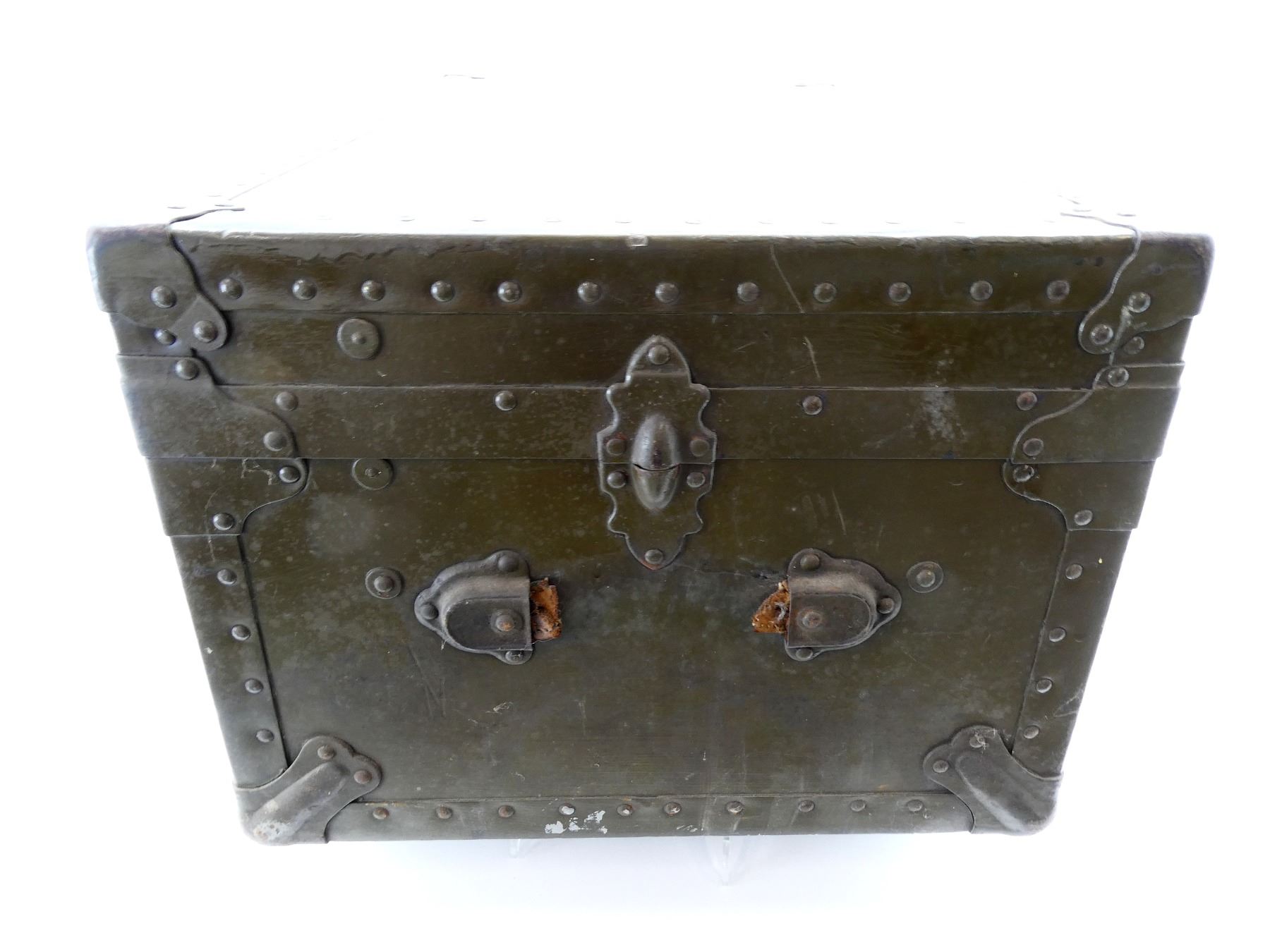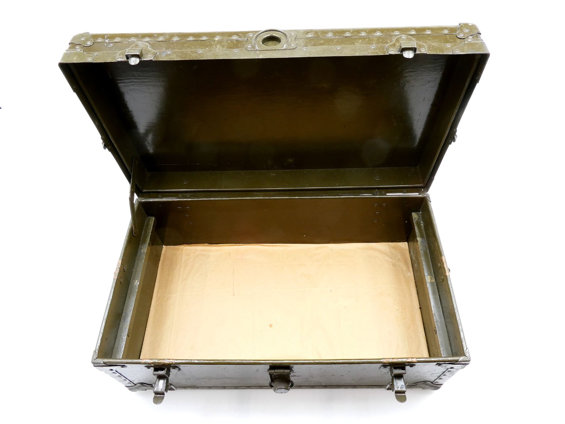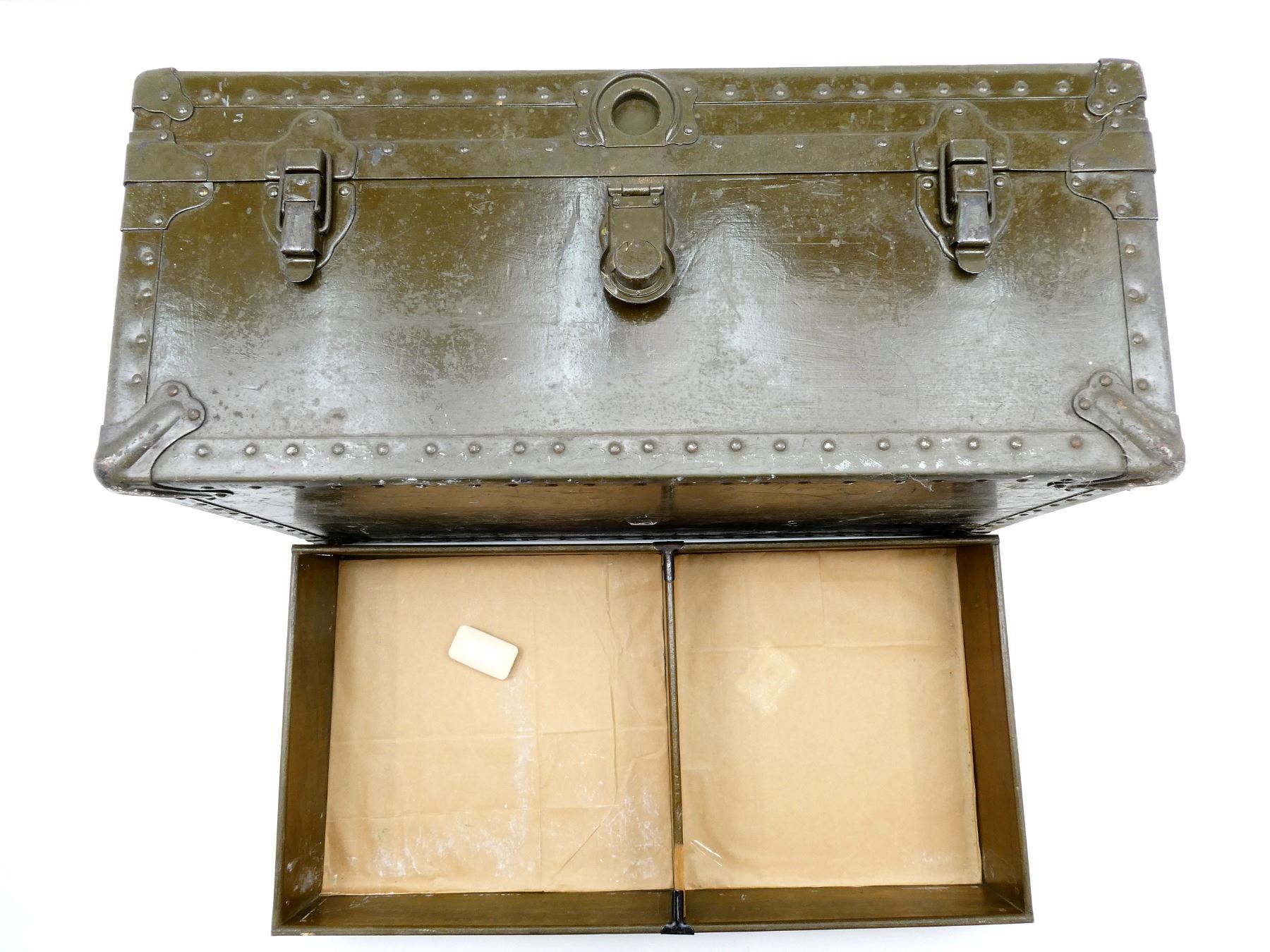 (1) GREEN PAINTED WOOD & METAL CONSTRUCTED TRUNK, DATA PLATE ON LID MARKED: "STOCK NO. 26-L 294, TENT. SPEC. DATED JUNE 12 1940, CONT. NO. W-199 QM-18786, C.Q.M.D. 8-9-40, KLEBER TRUNK & BAG CO." & VARIOUS OTHER MARKINGS ON TRUNK, MISSING / BROKEN LEATHER CARRY HANDLES ON EITHER SIDE, METAL HINGES / LATCHES, LOCKABLE, WITH KEY, WOODEN BOX INSERT INSIDE, LIFTS OUT, TRUNK SHOWS WEAR / TEAR, APPROX. 31" X 17.25" X 13". SEE PHOTOS.