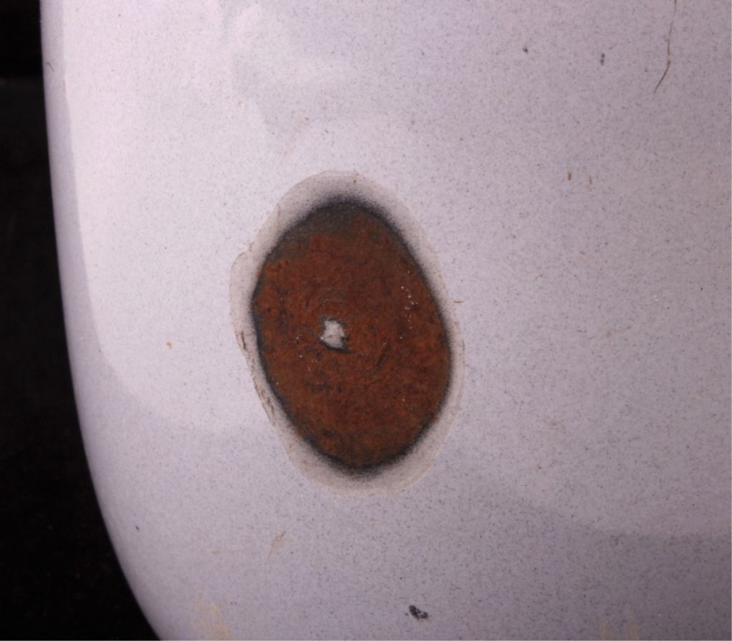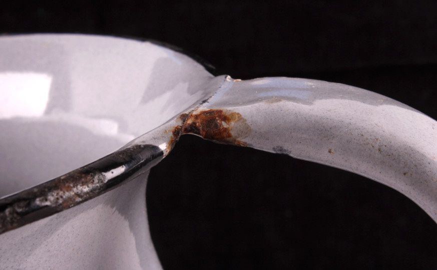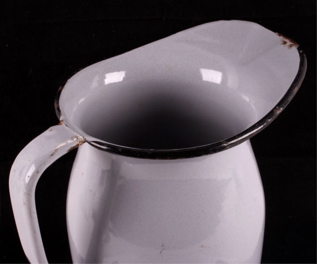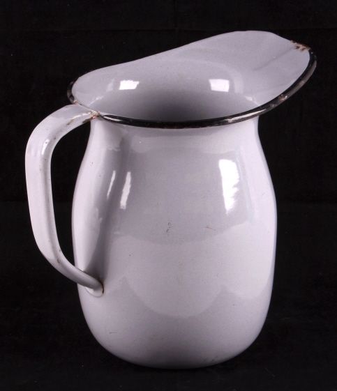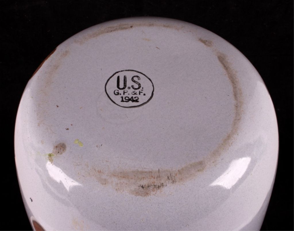 This is a WWII U.S. military enamelware  pitcher. The pitcher is marked on the bottom  "U.S. G.P.&F. 1942". G.P.&F. stands for  Gueder, Paeske & Frey, who produced canteens  and mess kits as well as other supplies during WWII. The pitcher does show some wear  and rust. It is in good overall condition.  The pitcher measures 7" in diameter and is  10.5" tall.
