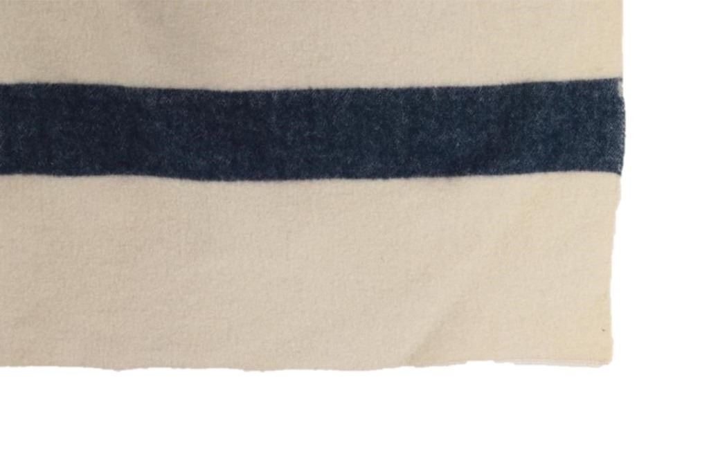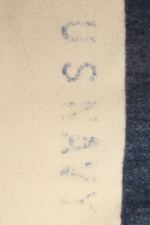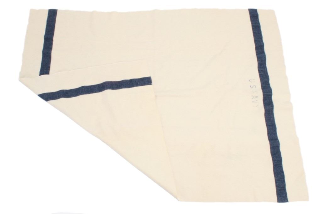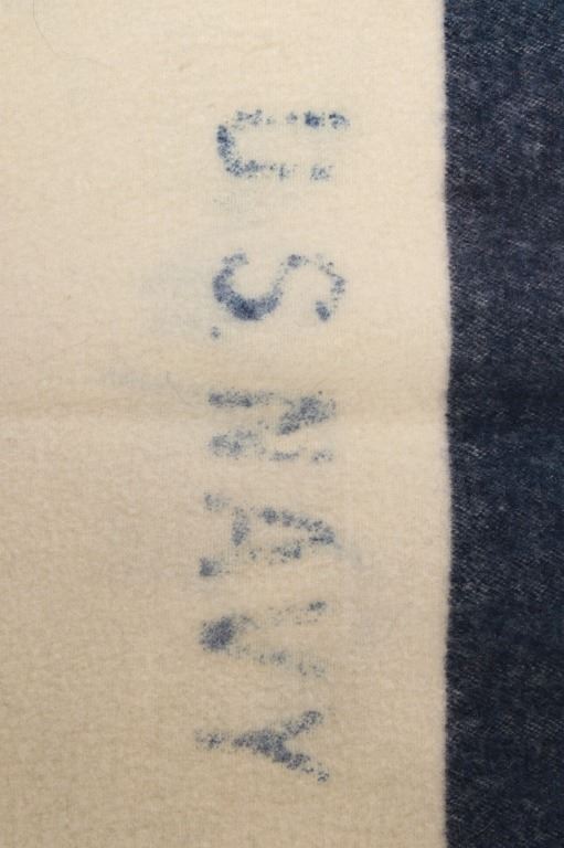 Offered in this lot for your consideration is an antique wool Navy medical blanket 1939-44. This is a WWII U.S. Navy wool blanket. The blanket is marked "U.S. Navy" and was used by the Medical Department during the war. The blanket is an off-white color with navy blue stripes and lettering. The blanket is in good condition. It measures 62" x 76".