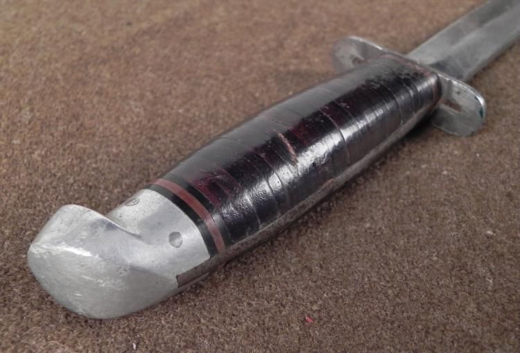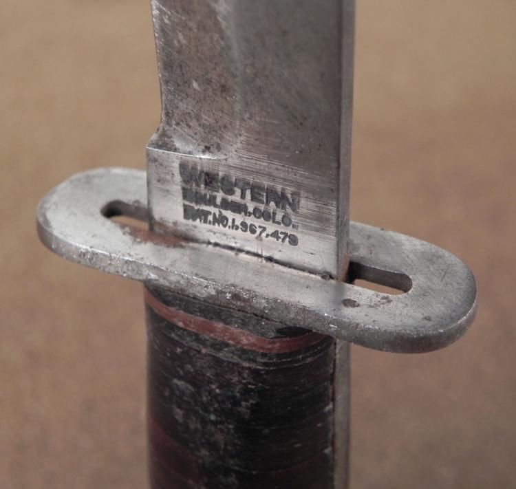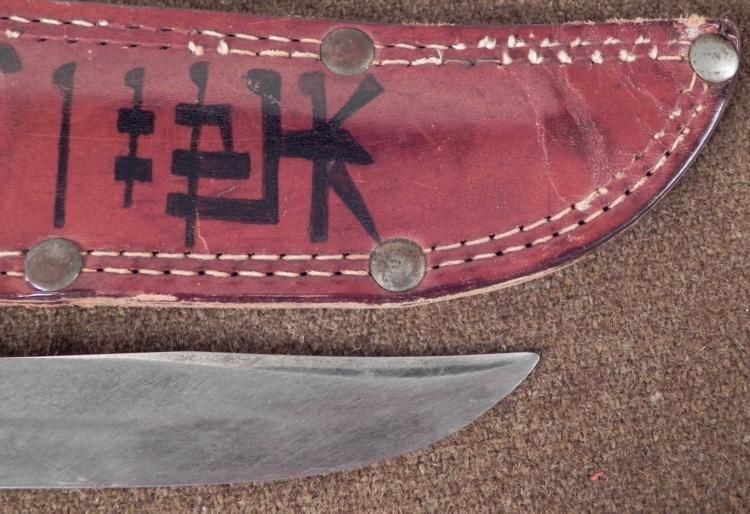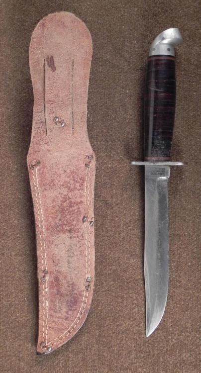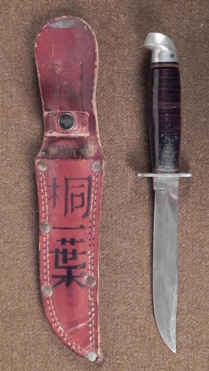 THIS IS A NICE WWII U.S. PACIFIC THEATRE FIGHTING KNIFE & LEATHER SHEATH, WITH JAPANESE WRITING. IT IS A FIXED BLADE KNIFE MADE BY "WESTERN" AND HAS A LEATHER WASHER GRIP. THE KNIFE HAS A METAL POMMEL & CROSSGUARD. THE BLADE IS 5 1/4" LONG. BLADE. IT COMES IN A NICE LEATHER SHEATH WITH A TOP SECURING SNAP. THE SHEATH HAS JAPANESE KANJI CHARACTERS. THE OVERALL LENGTH IS 10 1/2" LONG * *