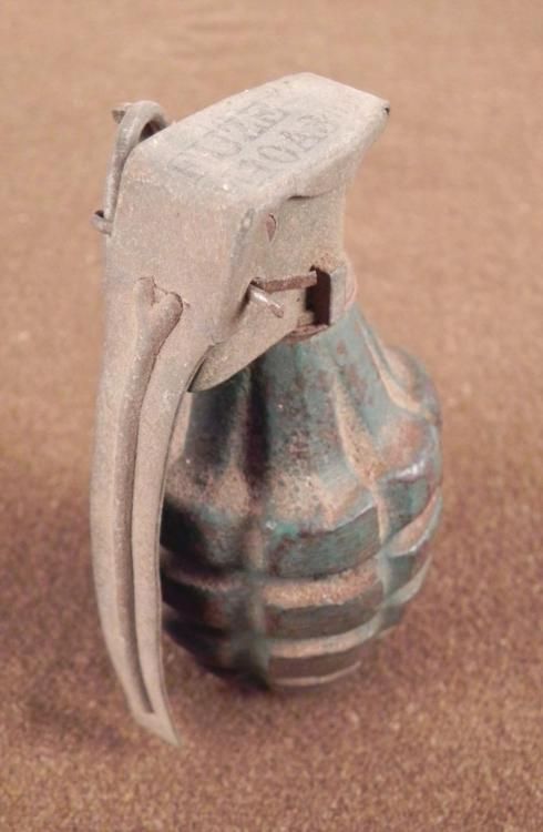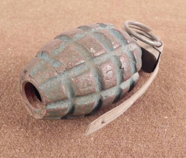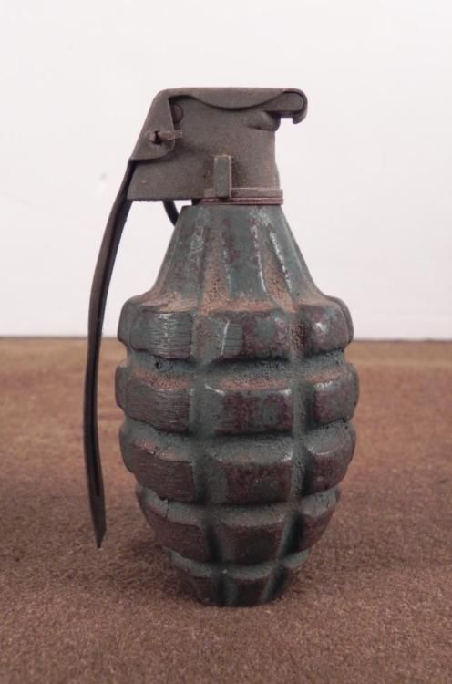 OFFERED HERE IS A WWII, COMPLETE INERT U.S. PINEAPPLE GRENADE THAT IS"DRILLED AT THE BOTTOM-FUSE 110A3.