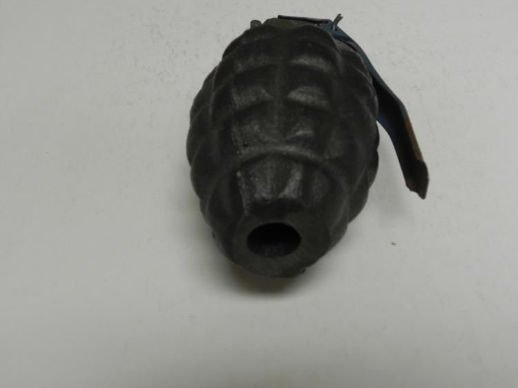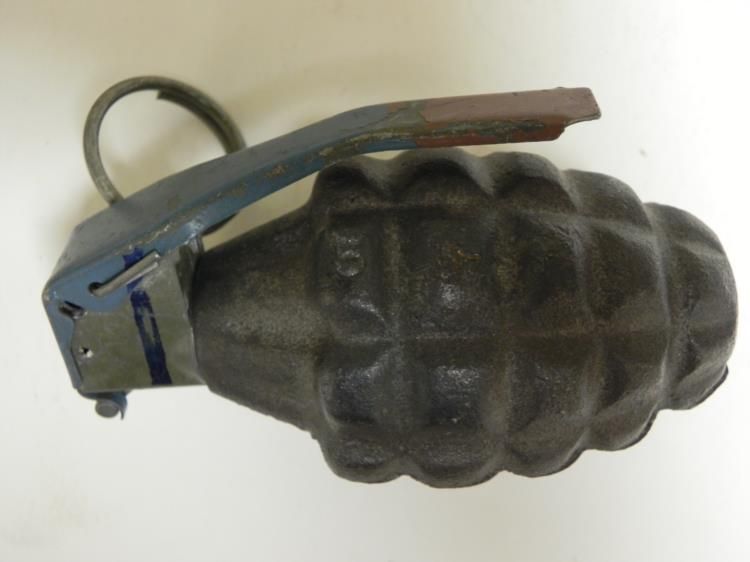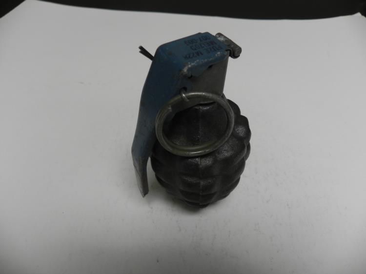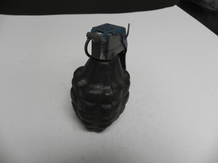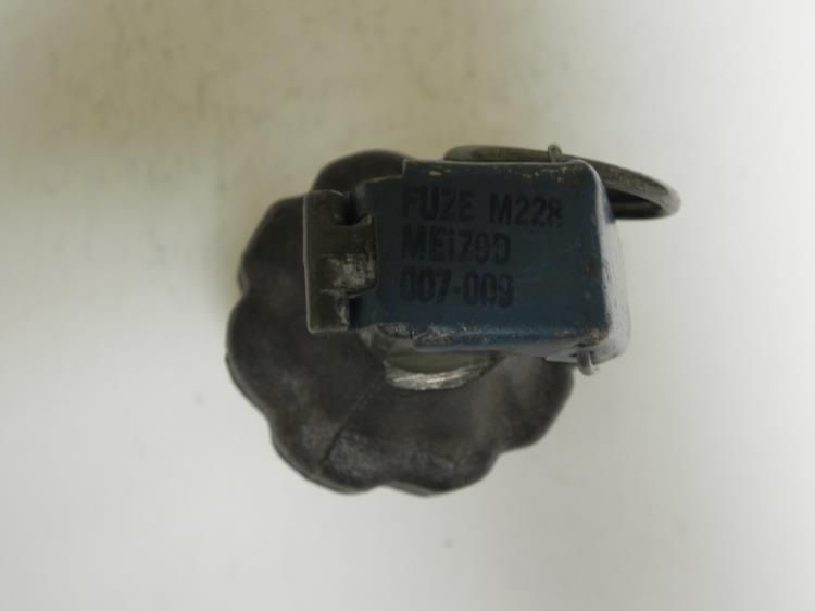 OFFERED HERE IS A WWII U.S. PINEAPPLE GRENADE-INERT- WITH TOP FUZE-PULL RING-DRILLED OUT AT BOTTOM-MARKED "RFX" AND "5-7)TOP MARKED "FUZE M228-ME 170D-007-009