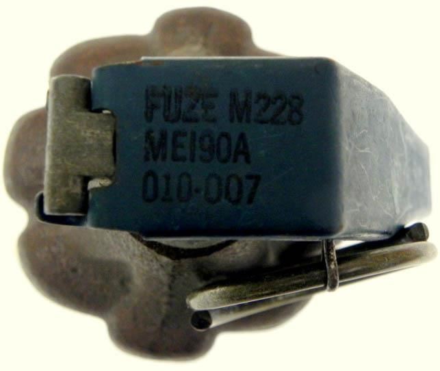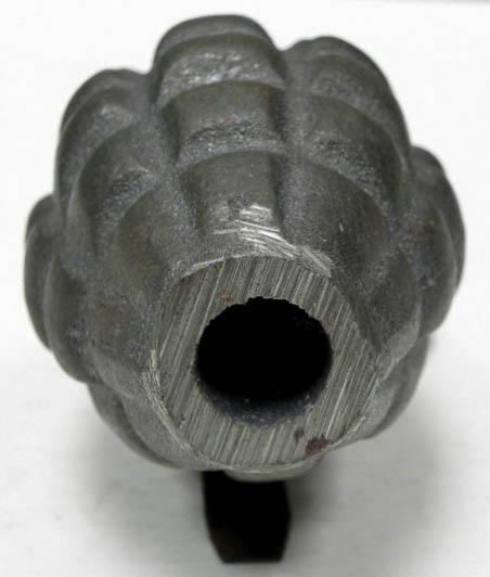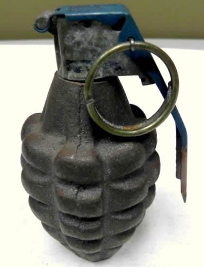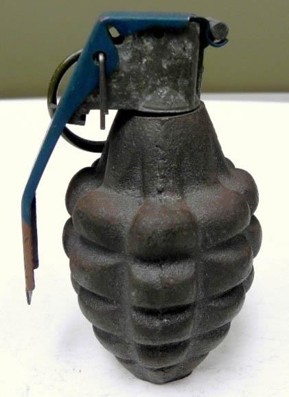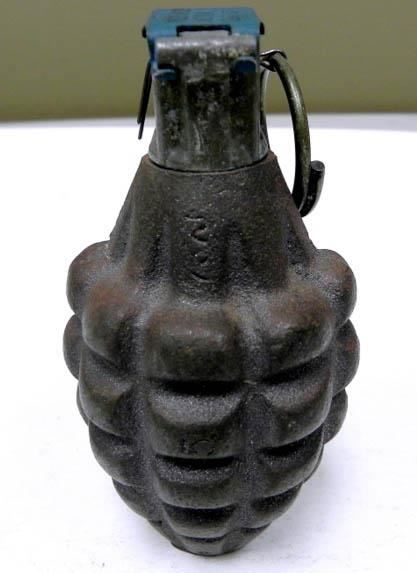 HERE IS A WWII U.S. PINEAPPLE HAND GRENADE-WITH FUZE-INERT. IT HAS A DRILLED ON BOTTOM/INERT--WITH PULL RING-TOP MARKED "FIZE M228-ME190A-010-007".