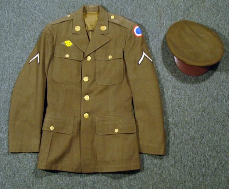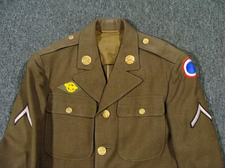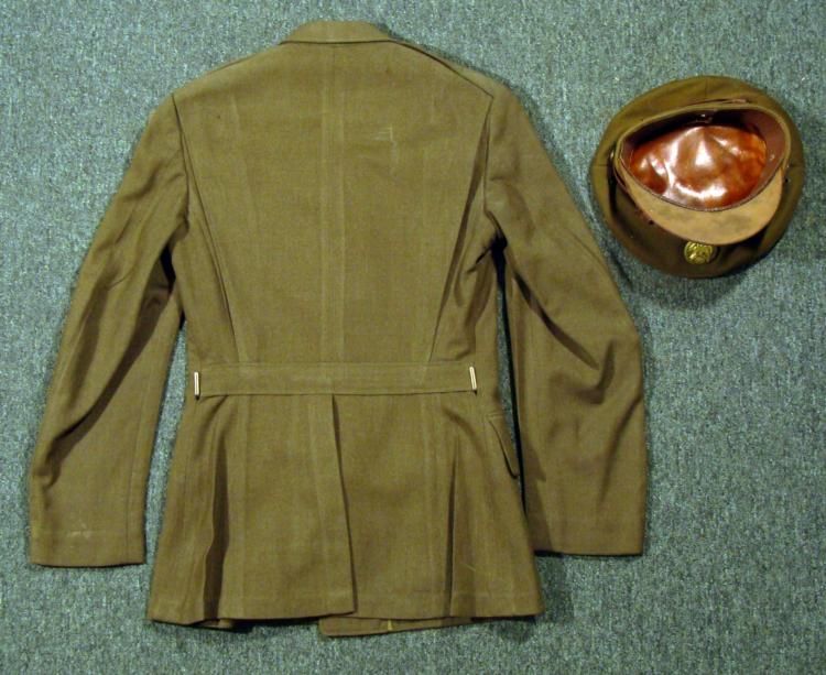 WWII UNIFORM COAT AND VISOR HAT--ALL PATCHES & BRASS-PATCH: ARMY GROUND FORCES-REPLACEMENT DEPOT * MEDIUM SIZE *