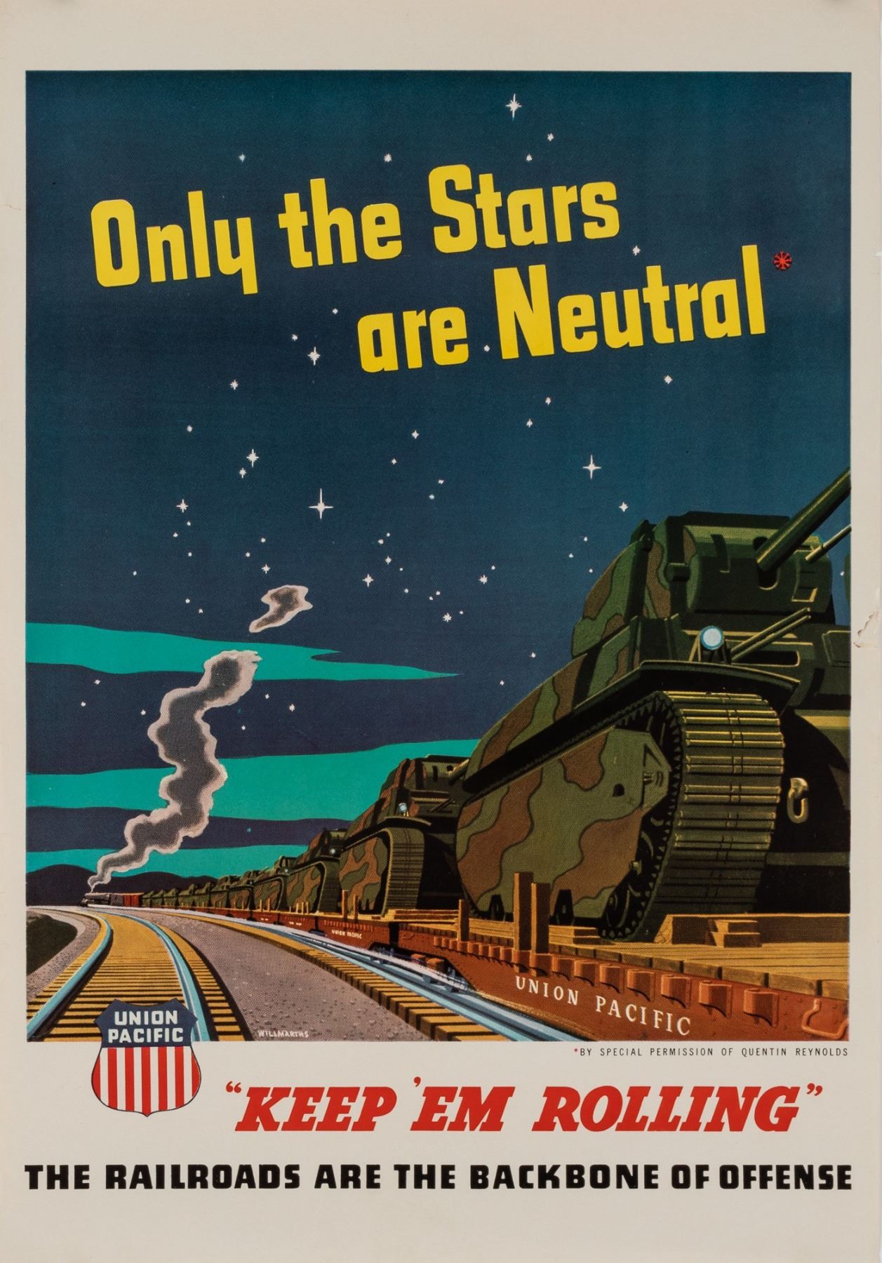 Only the Stars are Neutral - Keep 'Em Rolling', artwork by William A. Willmarths, (1898-?), quote by Quentin Reynolds, (1902-1965), Union Pacific Railroad, circa 1945, 22.5 x 15.5 inches. Loss on right edge.