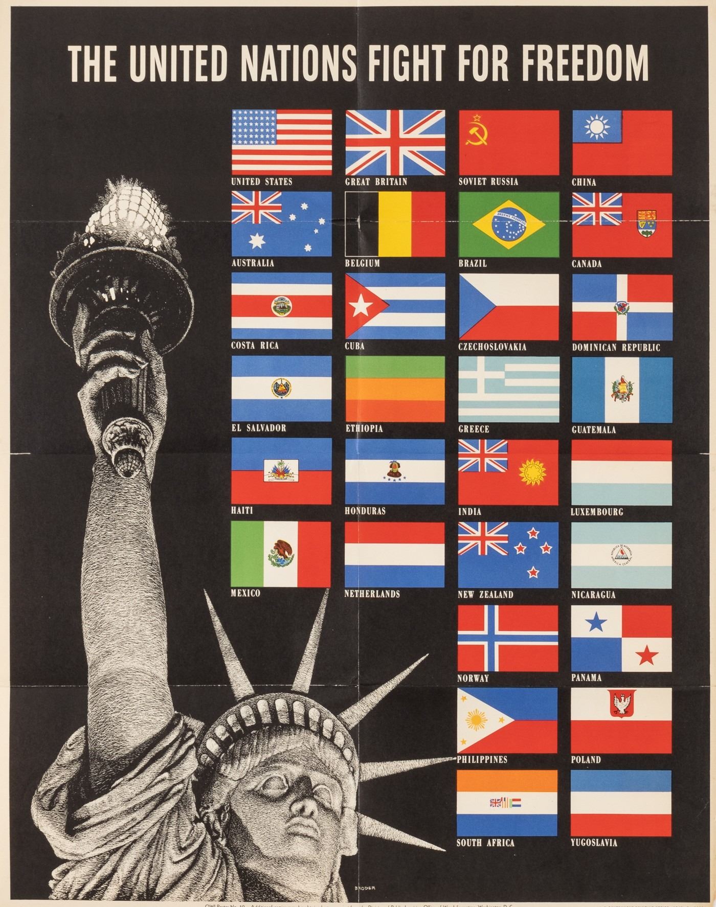 American WWII poster, 'The United Nations Fight for Freedom', artwork by Steve Broder (1906-1992), OWI poster No. 19, US Government Printing Office, 1942-O-498304, 22 x 28 inches. Mailing folds and loss at bottom right corner.