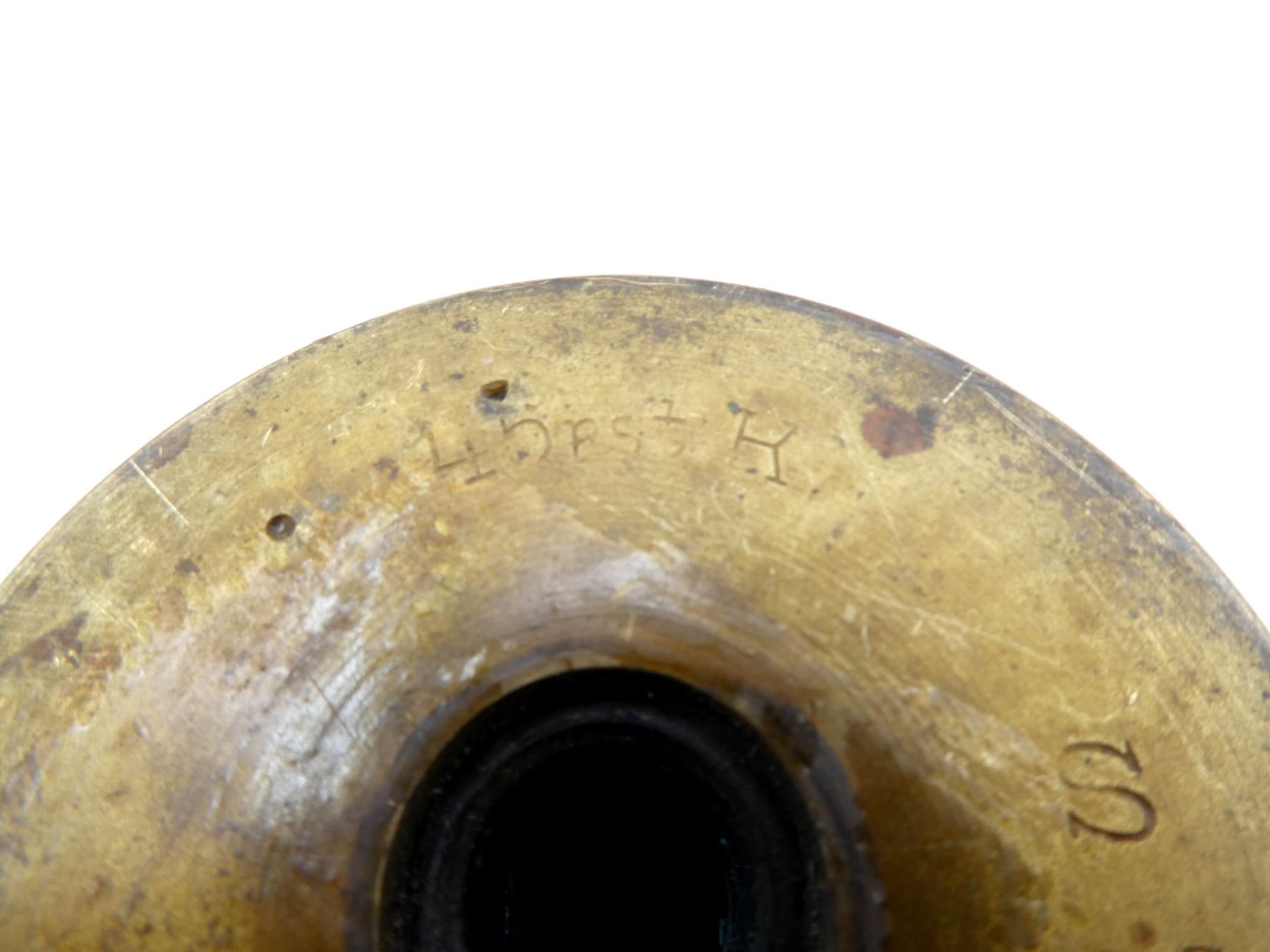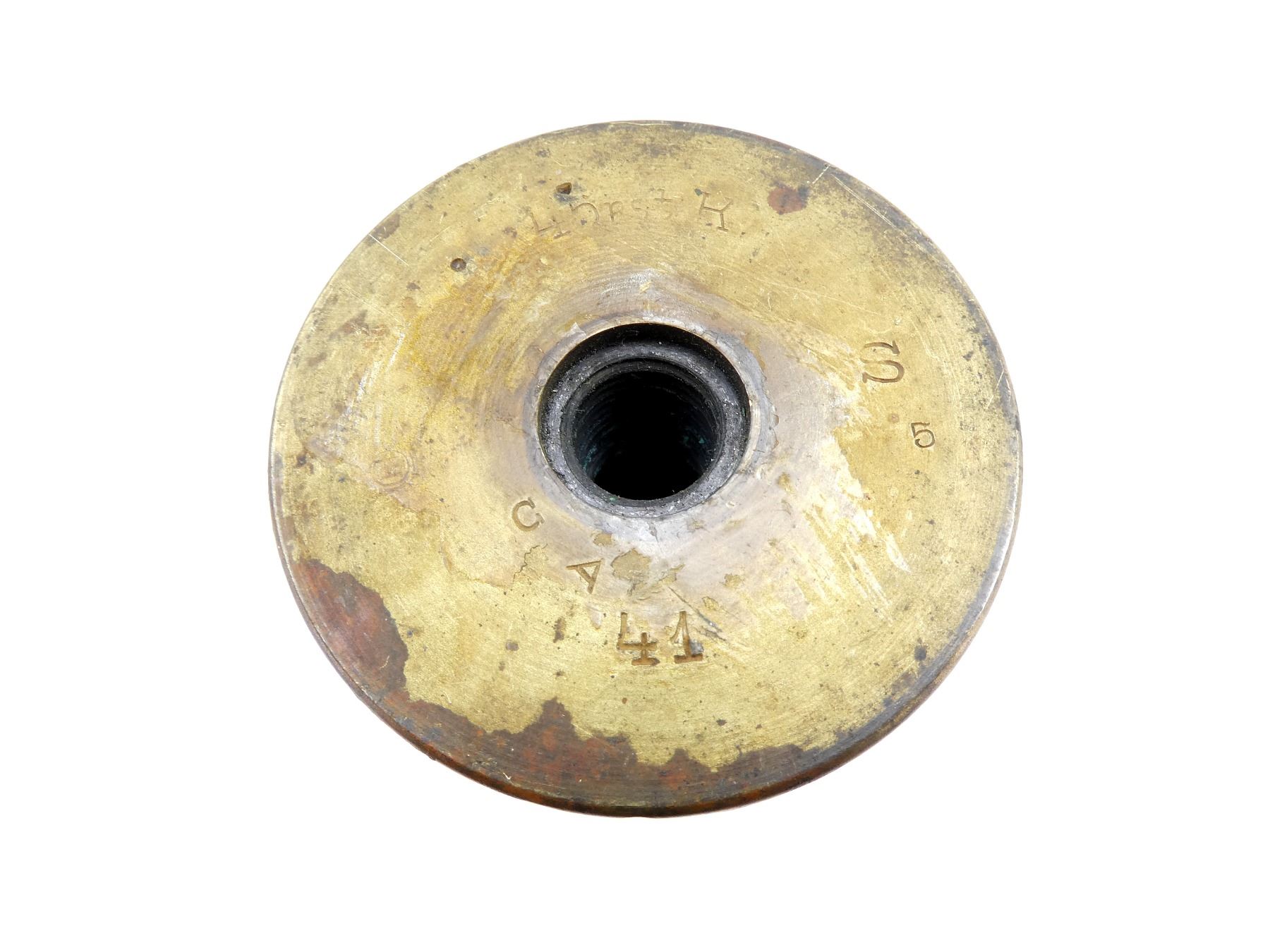 (1) BRASS SHELL CASING, NO PRIMER, MARKED: "41" AND VARIOUS FAINT / UNCLEAR MARKINGS, APPROX. DIA. 2.25", APPROX. OAL 12.25". SEE PHOTOS.
