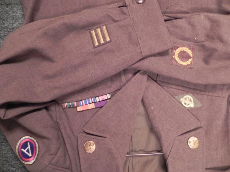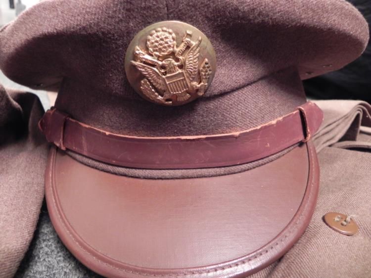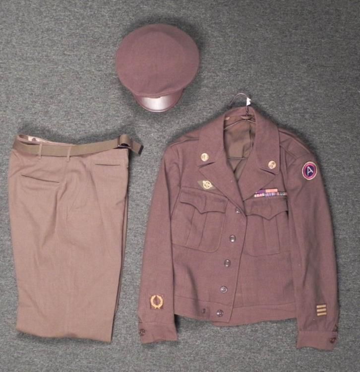 WWII US 3RD ARMY FULL UNIFORM WITH VISOR HAT--ORDNANCE INSIGNIA-RIBBON BARS * GREAT WWII THIRD ARMY UNIFORM--HAS 3RD ARMY PATCH ON SLEEVE WITH "US" AND "ORDNANCE BRASS" ON COLLAR--SIZE 40R--2 ROWS OF RIBBON BARS (PURPLE HEART-GOOD CONDUCT-EUROPEAN,AFRICAN,MIDDLE EASTERN "WITH 3 STARS"-AMERICAN,OUTSIDE US +--PANTS W/WEB BELT-SIZE W36 & L35 PANTS-PLUS ENLISTED VISOR HAT SIZE 7 1/8--ALL IN GOOD CONDITION