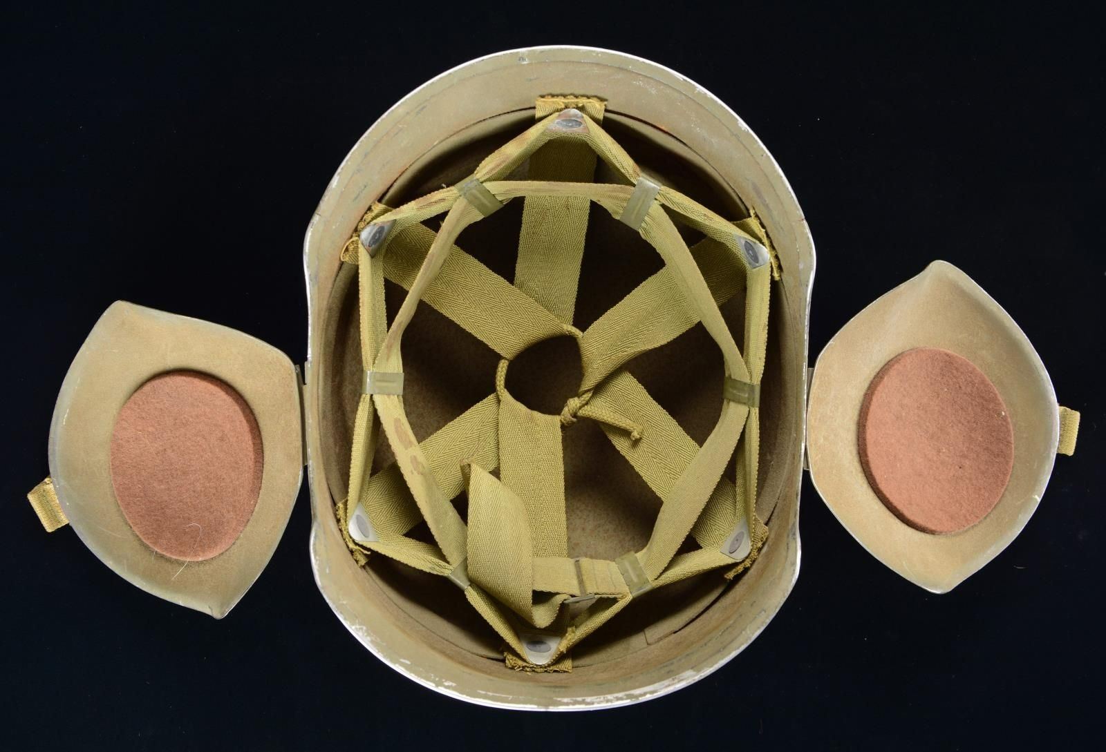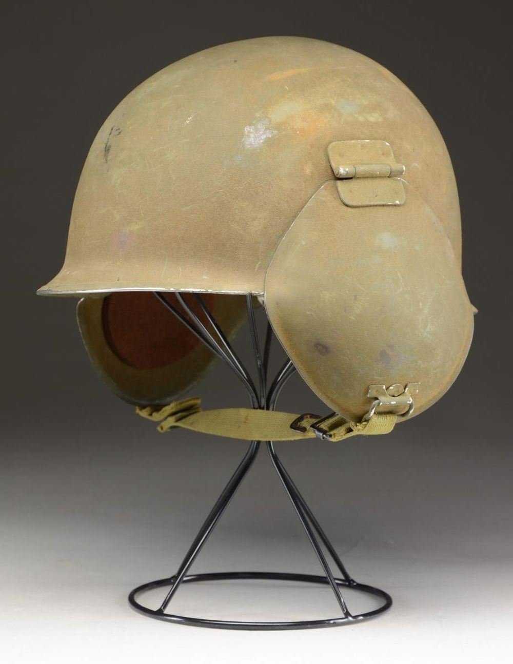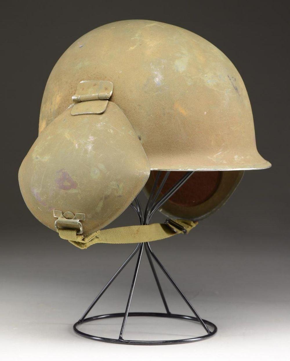 A nice example of a scarce B-17 flak helmet for an aerial gunner. The helmet has a lightly sanded field green finish with hinged, padded ear flaps. At the base of the ear flaps are loops to affix the snap chinstrap. Khaki web liner. CONDITION: helmet finish is approx. 90%. Both the liner and the chinstrap are complete and strong. (02-21862/BF). $200-300.