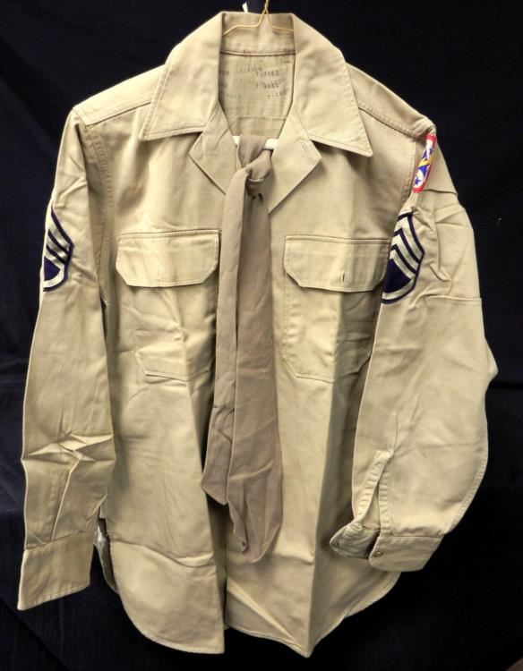 WWII US ARMY HEAVY TAN COTTON FIELD SHIRT HAS STAFF SGT PATCH AND WESTERN PACIFIC PATCH-& DRESS TIE---GREAT CONDITION-MEDIUM SIZE