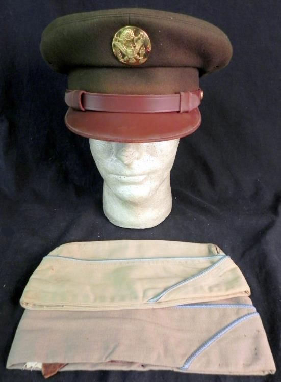 WWII US ARMY VISOR HAT-PRV PURCHASE-MOHAIR-INSIGNIA-ID'D--+ 2 SIDE CAPS---HIGH QUALITY-BEAUTIFUL BROWN MOHAIR WOOL VISOR WITH LEATHER FRONT VISOR AND WRAP-AROUND CHINSTRAP-VET'S ID INFO INSIDE AND MAKER MARKED "THE COLUMBIA-NY"- ALSO 2 TAN SIDE CAPS