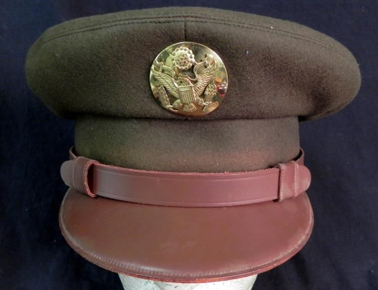 WWII US ARMY VISOR HAT-PRV PURCHASE-MOHAIR-INSIGNIA-ID'D--+ 2 SIDE CAPS---HIGH QUALITY-BEAUTIFUL BROWN MOHAIR WOOL VISOR WITH LEATHER FRONT VISOR AND WRAP-AROUND CHINSTRAP-VET'S ID INFO INSIDE AND MAKER MARKED "THE COLUMBIA-NY"- ALSO 2 TAN SIDE CAPS