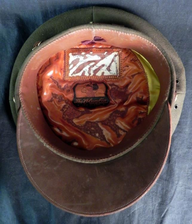 WWII US ARMY VISOR HAT-PRV PURCHASE-MOHAIR-INSIGNIA-ID'D--+ 2 SIDE CAPS---HIGH QUALITY-BEAUTIFUL BROWN MOHAIR WOOL VISOR WITH LEATHER FRONT VISOR AND WRAP-AROUND CHINSTRAP-VET'S ID INFO INSIDE AND MAKER MARKED "THE COLUMBIA-NY"- ALSO 2 TAN SIDE CAPS