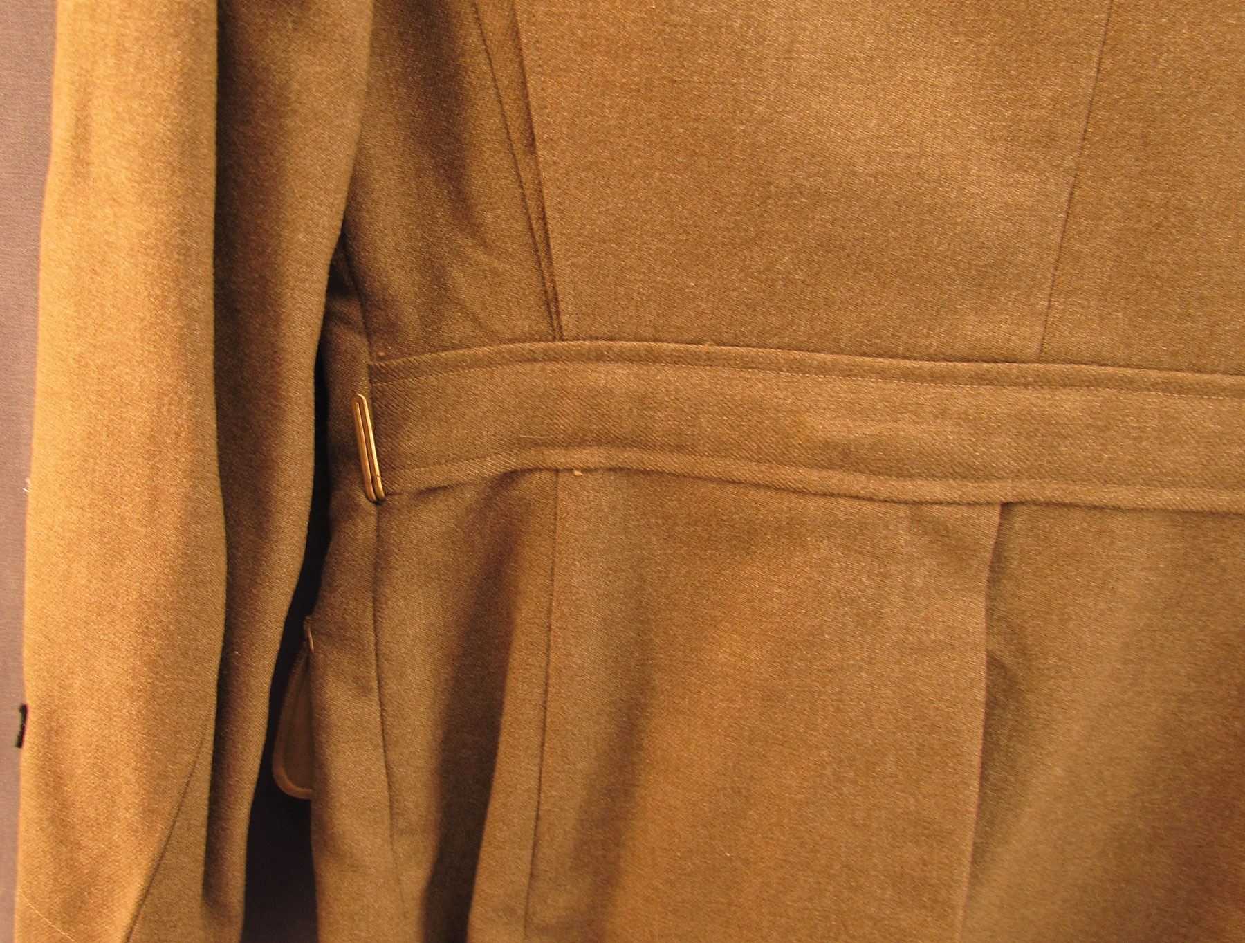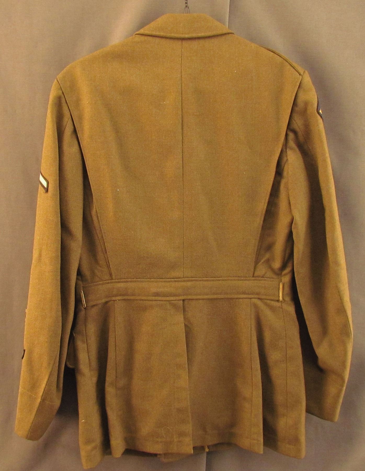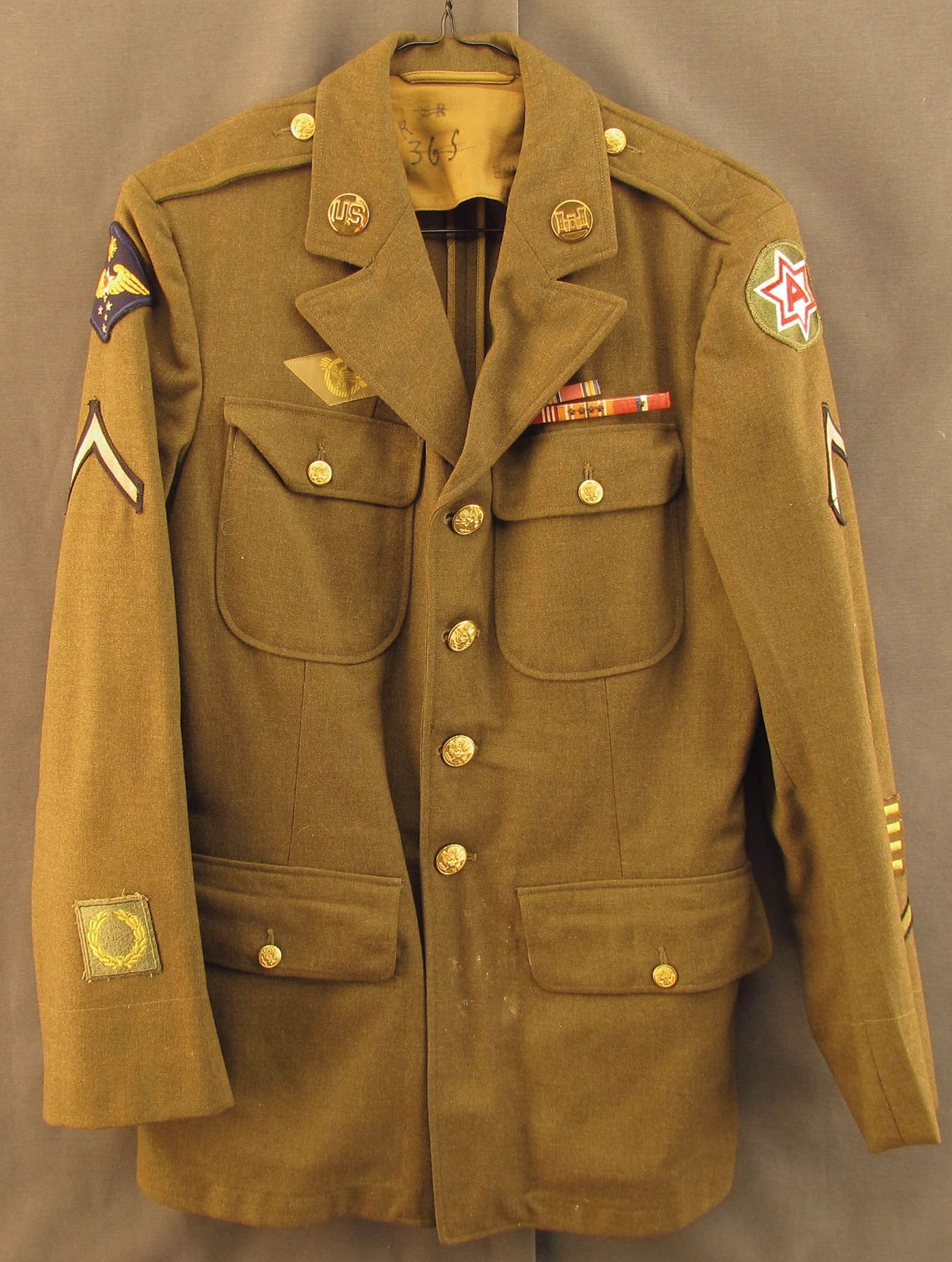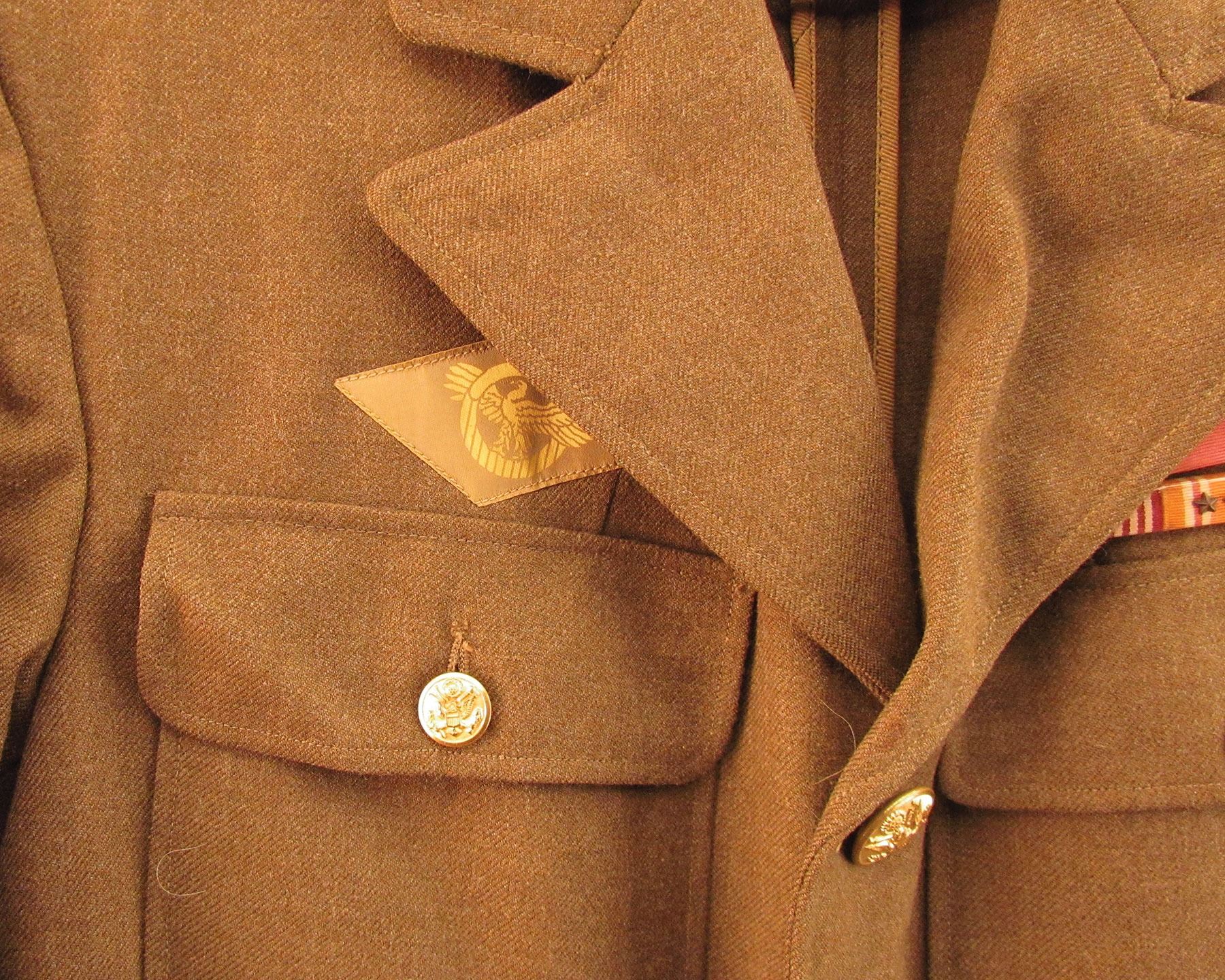 US Army WWII enlisted man's service jacket, size 36, worn by a private first class who served in an aviation engineer unit in the Pacific theater of operations. The jacket was made by Rose Bros., under a March 1942 contract with the Philadelphia QM Depot. The insignia on this jacket reveal that its owner saw extensive action, participating in four campaigns, and was wounded once. The jacket (pattern of 1939) bears a US Sixth Army patch on the left sleeve and a Far East Air Force patch on the right. The latter patch appears to be Australian made. The jacket has its original “US” and engineer lapel disks, ribbons (Pacific theater with four battle stars, Philippine liberation with one battle star, WWII Victory, and good conduct), a Presidential unit citation patch on the right cuff, four hash marks on the left sleeve indicating two years of service overseas, and PFC chevrons and a wound stripe. In very good to fine condition, with just minor soiling.