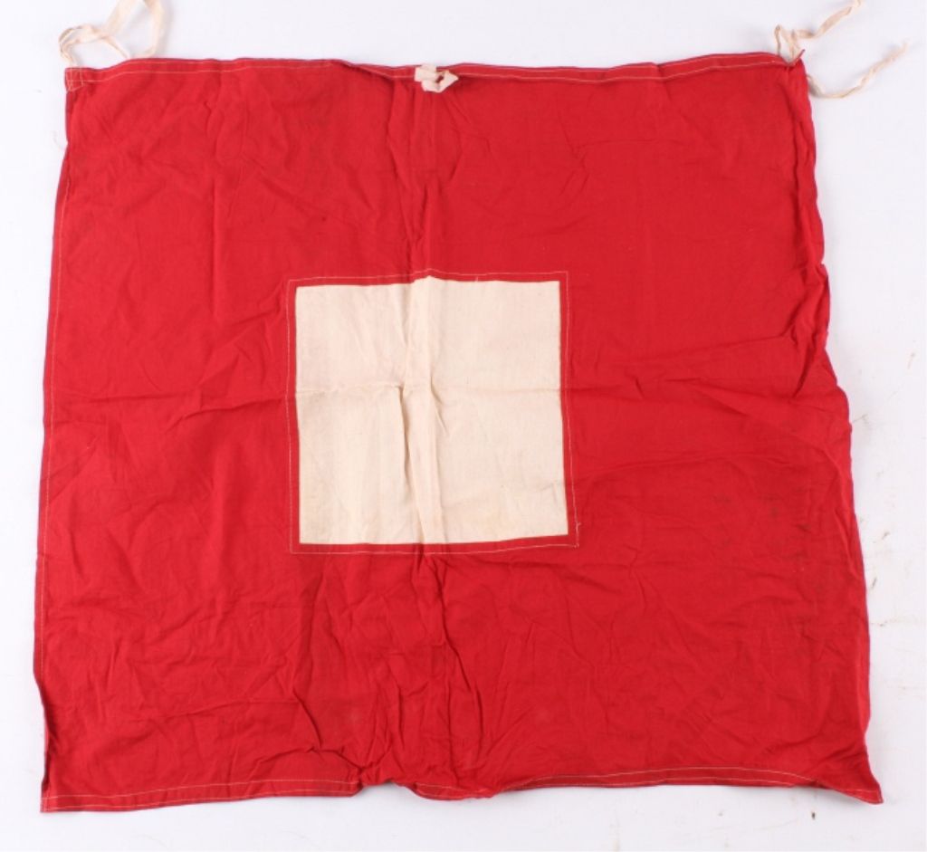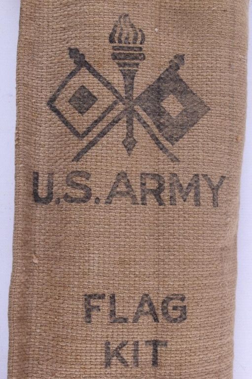 This is an original World War II United States Army Semaphore Flag Kit. The complete set is rare to find and comes with the canvas bag, brass flag pole, extension and flag.