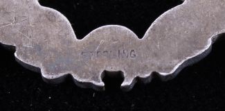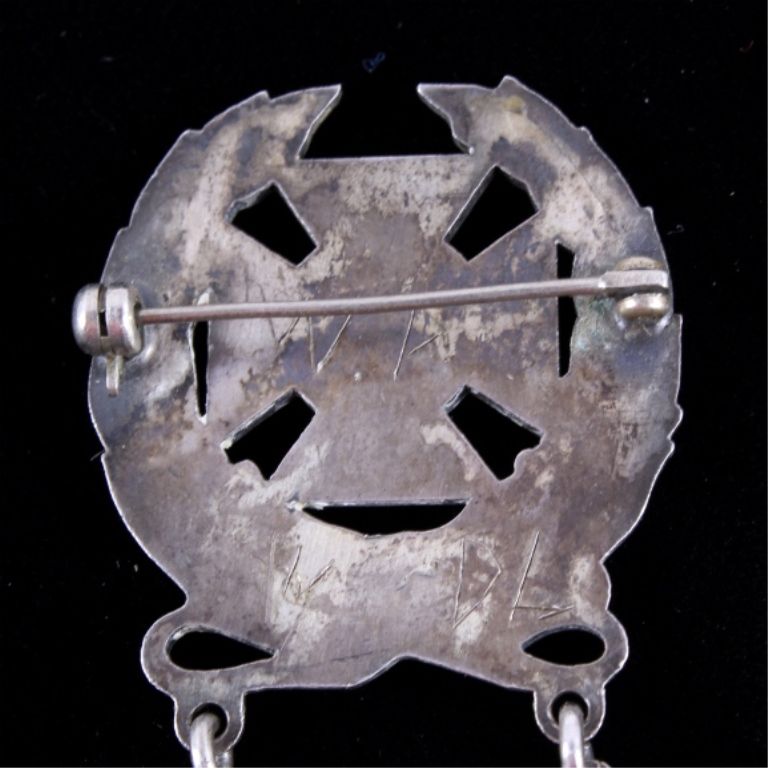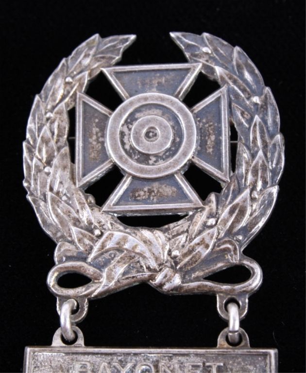 This is a World War II US Army Marksman badge or pin that shows a rare amount of qualifications or achievements. The badge shows the top cross and wreath and below six drop down pieces (Bayonet, Bayonet, Rifle, Rifle, Auto. Rifle) and the crossed guns and wreath marked sterling. Rare to see the badge with so many extra pieces. Measures 5.25" l x 1 3/8" w.