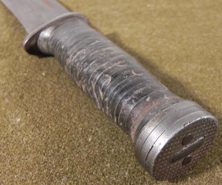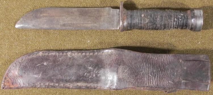 WWII US CATTARAUGUS 225Q COMBAT FIGHTING KNIFE W/SHEATH-ORIGINAL * NICE WWII USED IN COMBAT SURVIVAL KNIFE-LEATHER WASHER GRIP & ORIGINAL LEATHER SHEATH. 10 1/2" WITH 6" BLADE. * *