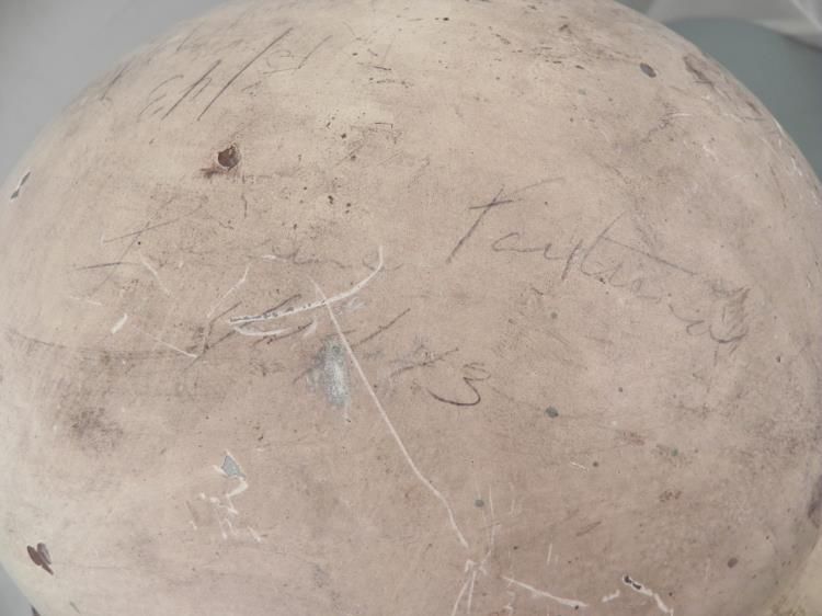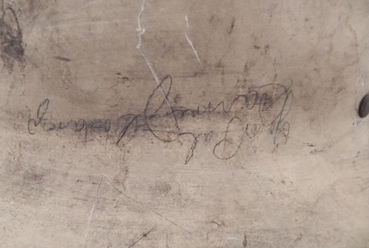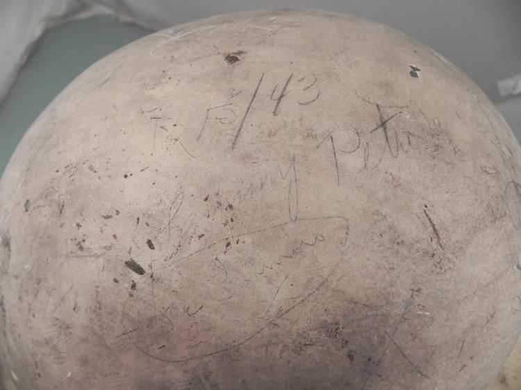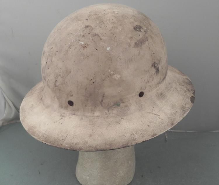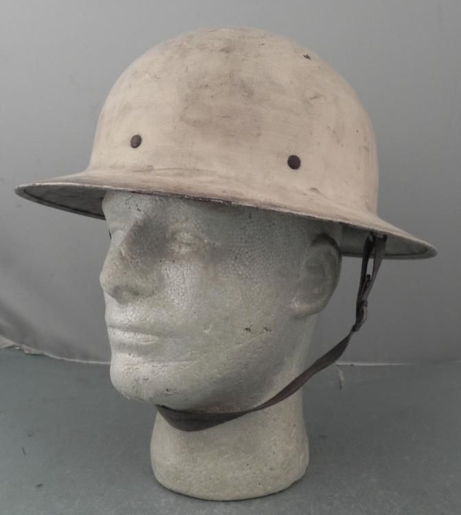 WWII US CIVIL DEFENSE HELMET-MARKED 1943 & SIGNATURES ON TOP * * * INSIDE BRIM STAMPED "U S GOVT PROPERTY-OCD"--ALL STRAPS & CHINSTRAP PRESENT