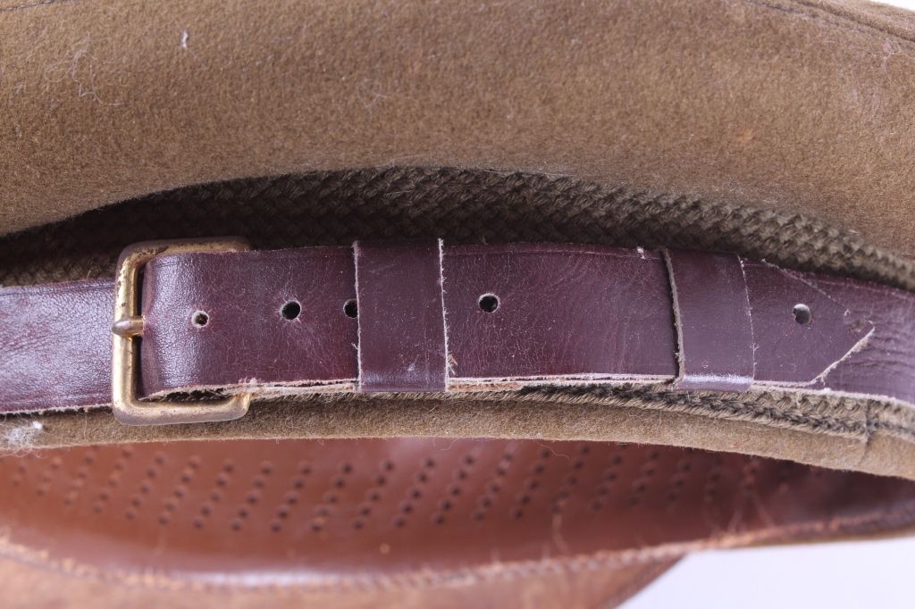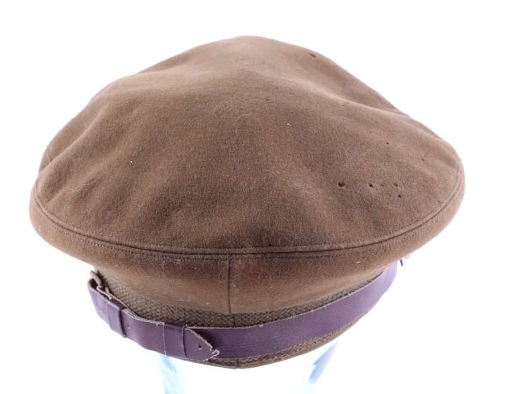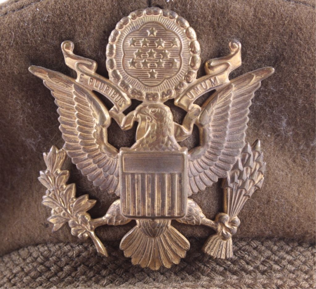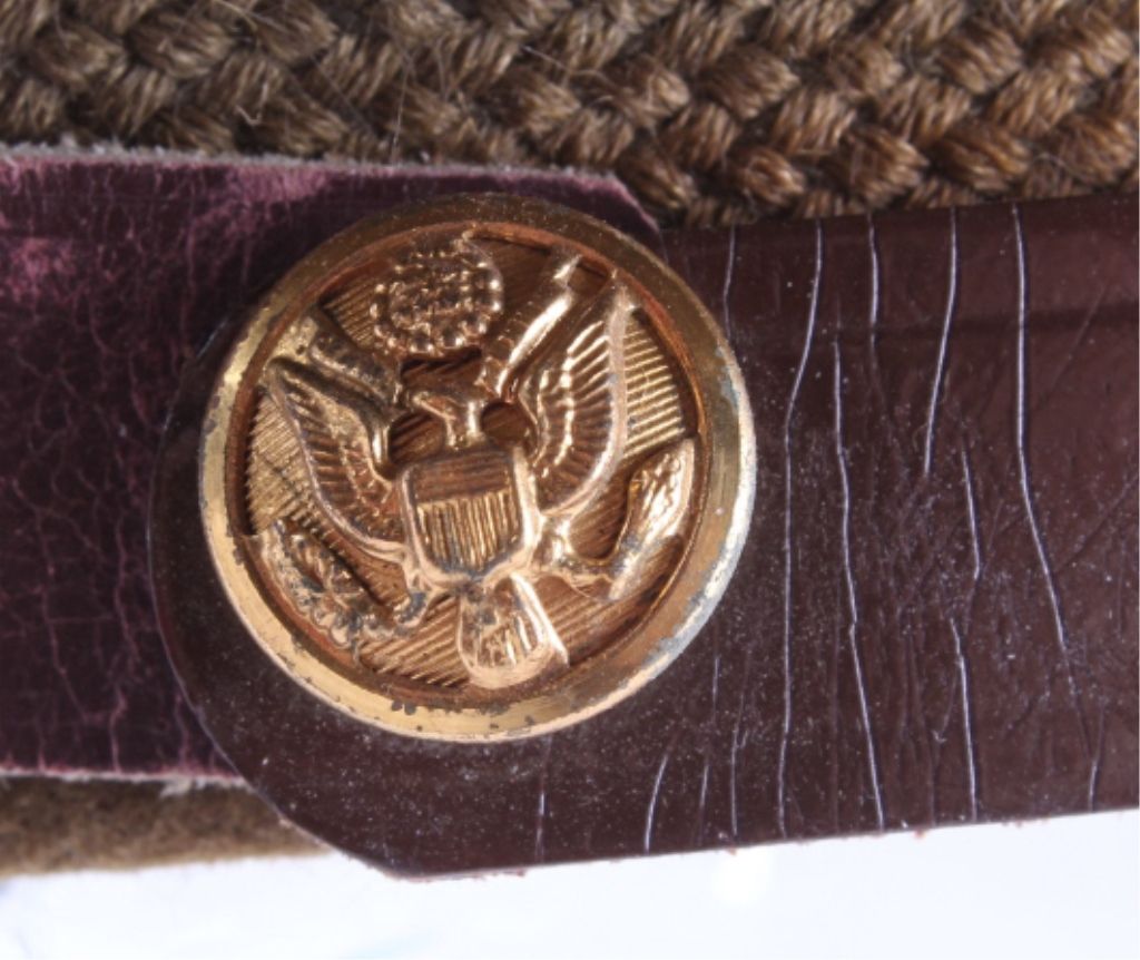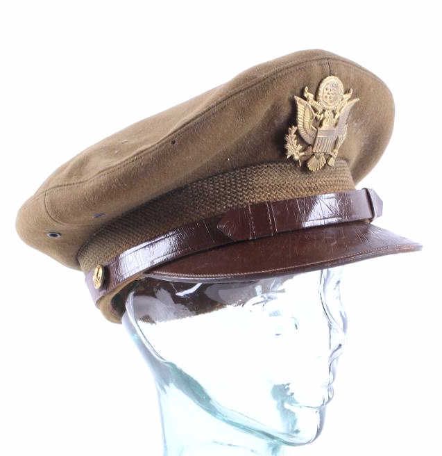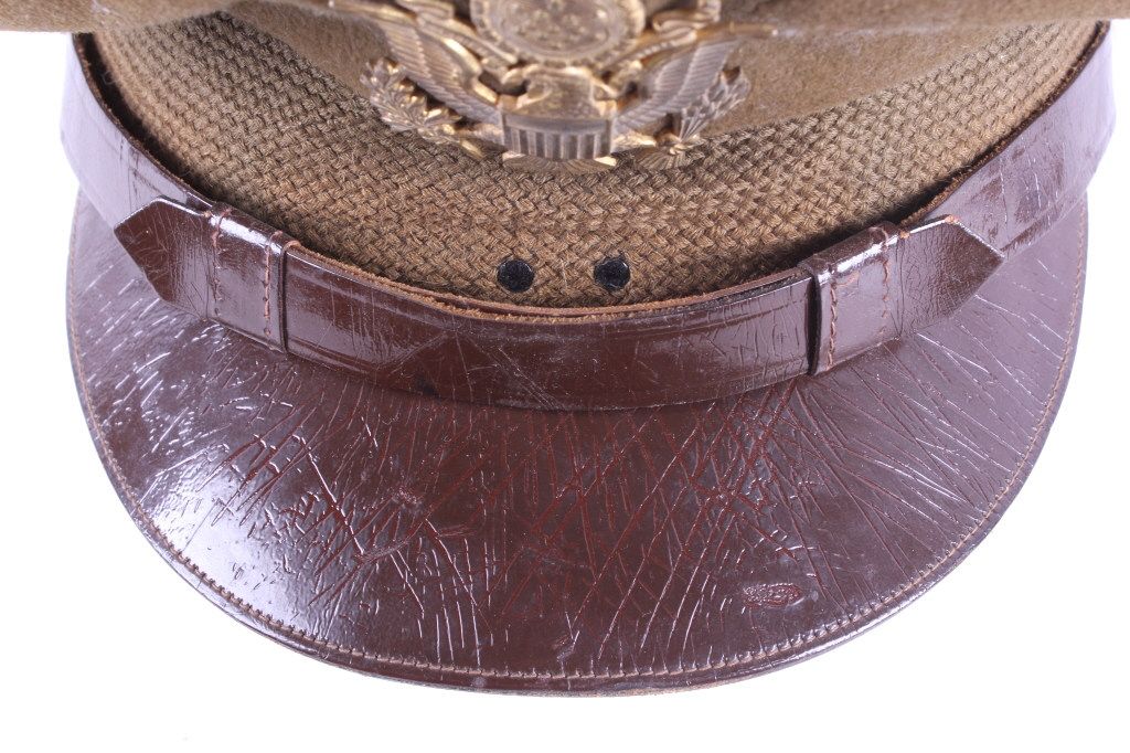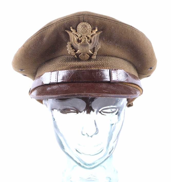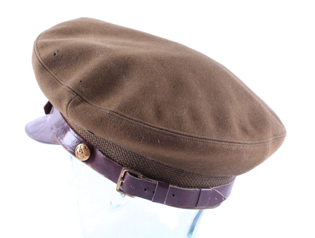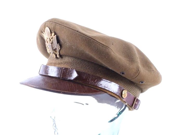 This is a United States World War II Cavalry Officers crush cap. The piece shows the officers badge across the front with a leather visor and back strap. The cap was made by Nudelman Bros out of Portland Seattle. This is a peaked top rare cap showing overall good condition.