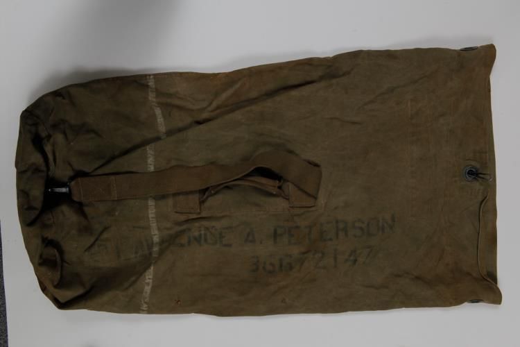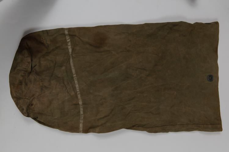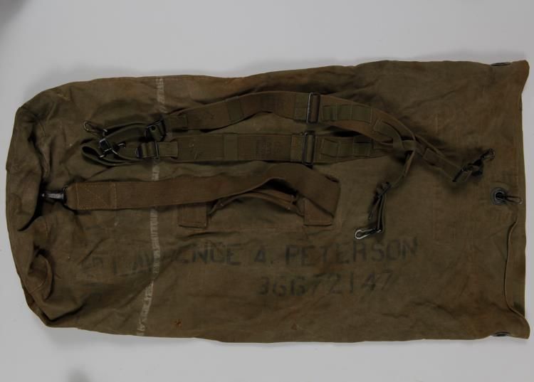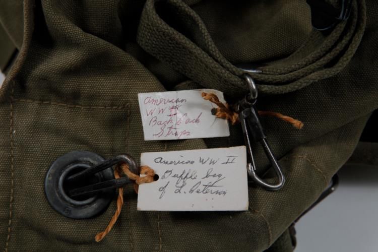 WWII US DUFFEL BAG AND CANVAS BACK PACK STRAPS-NAMED DUFFELBOTH HAVE IDENTIFICATION TAGS HANDWRITTEN BY VET