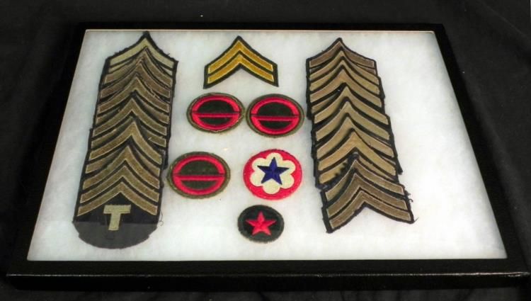 Available are these WWII US Divisional Patches and Chevrons. They come in a case that is 16.5" x 12.5". There are a total of 18 Chevrons (7, 1, 10), and 5 patches.