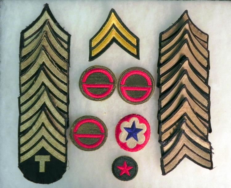 Available are these WWII US Divisional Patches and Chevrons. They come in a case that is 16.5" x 12.5". There are a total of 18 Chevrons (7, 1, 10), and 5 patches.