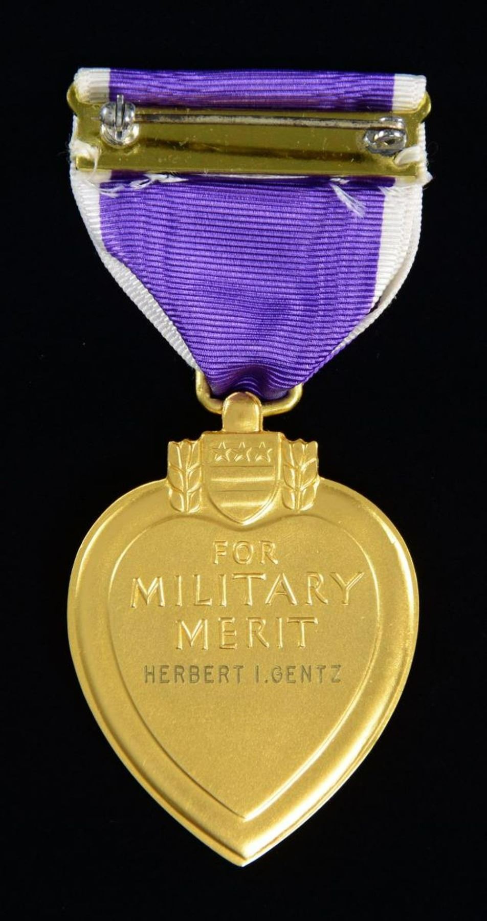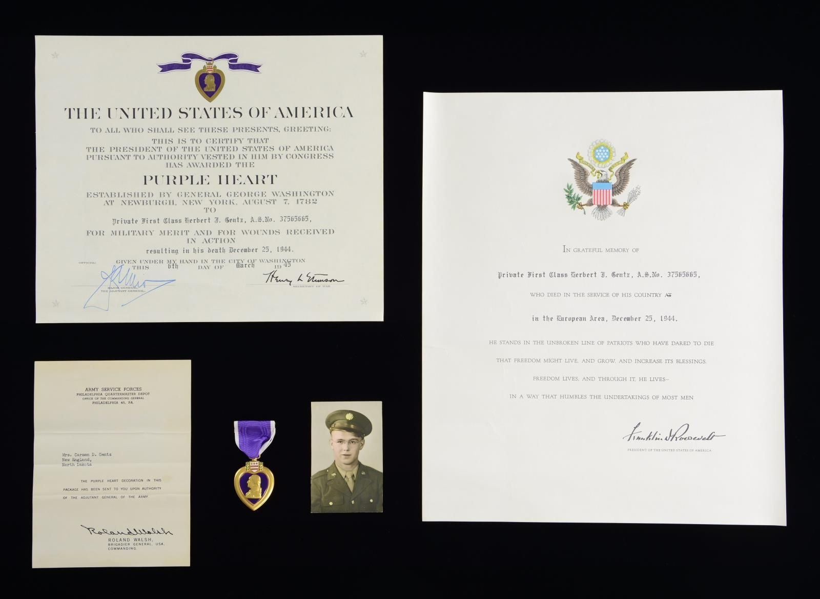 This group includes a named Purple Heart belonging to PFC Gentz, and the award document for this medal dated March 6, 1945. There is also a short note from Brigadier General Walsh to Mrs. Gentz. Also included is a large Grateful Memory certificate with a facsimile signature of President Franklin Roosevelt. Lastly, the group contains a small photograph of PFC Gentz in uniform. The date of action was December 25, 1944, so there is a high likelihood Gentz was killed in operations during the Battle of the Bulge. CONDITION: all items show very light wear. All documents are crisp & clear. PROVENANCE: From the Lifelong Collection of Glen E. Mattox. (02-18539/BF). $300-500.